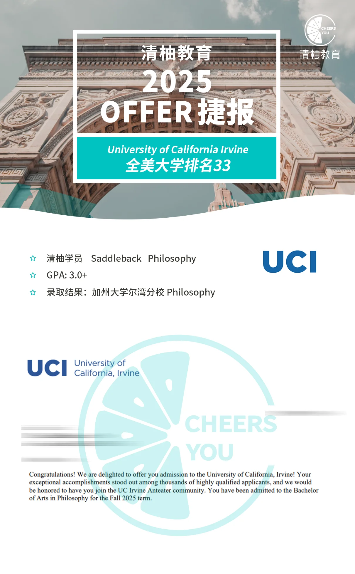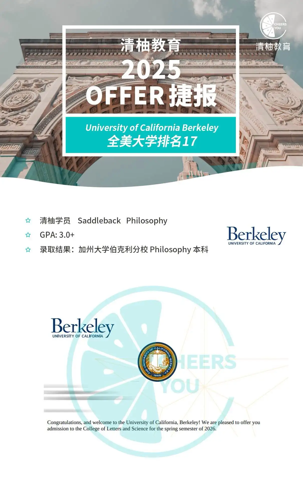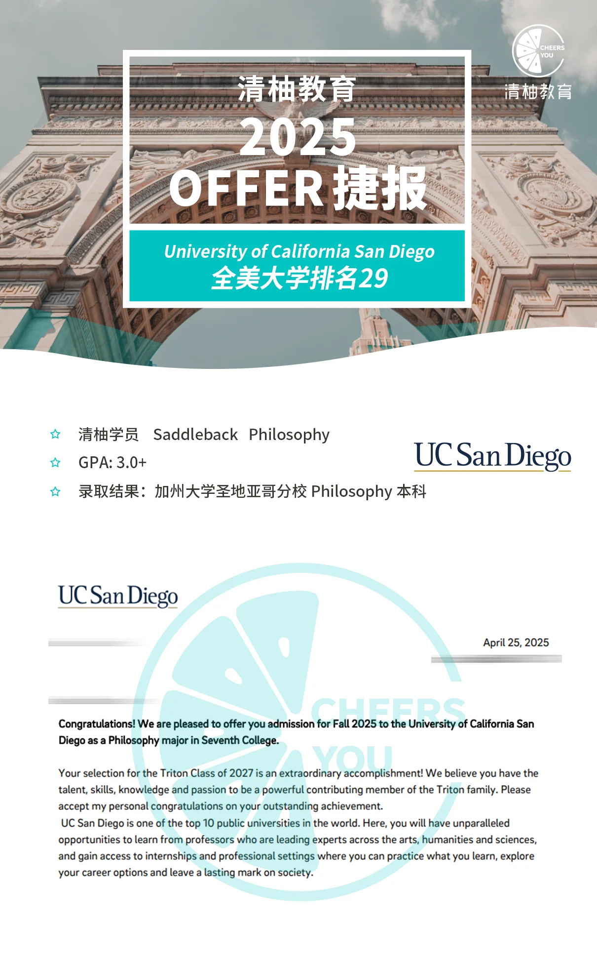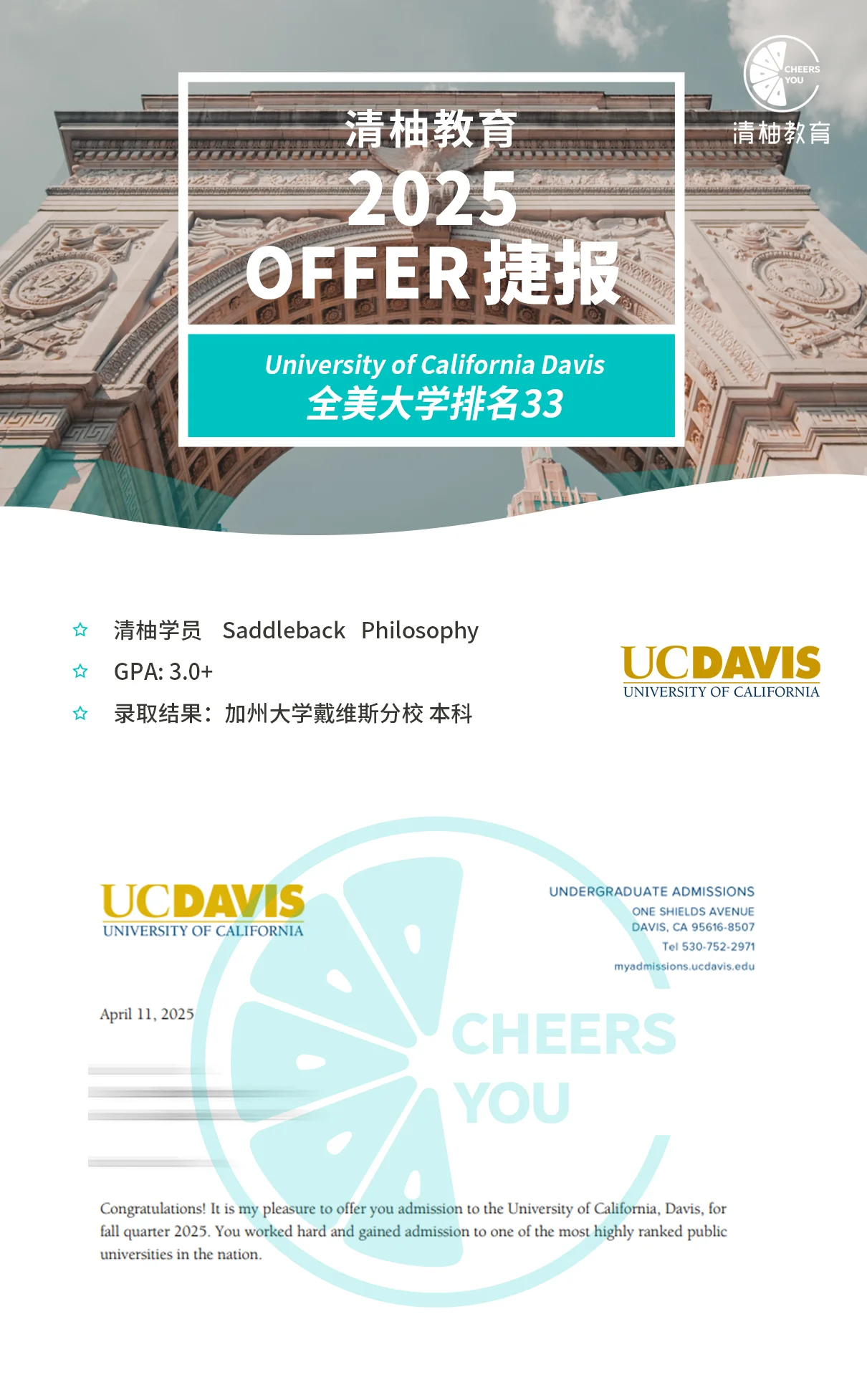 同时,清柚老师也告诉Jessie像她想申请的哲学方向,对于经历和文书这些能够体现申请者思考能力的材料也会相当重视。而她丰富的活动量和强硬的技能点,如果能在文书中得到出色的展现,将会有很大的加成帮助,拿下顶尖UC名校并非遥不可及。