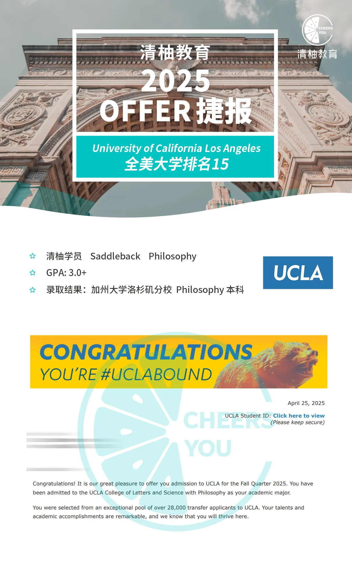 Jessie的社区大学生活在充实而丰富的活动中就要结束了,她也实现了转学全满贯,最终收获来自UCLA、UCB、UCSD等UC名校的OFFER!