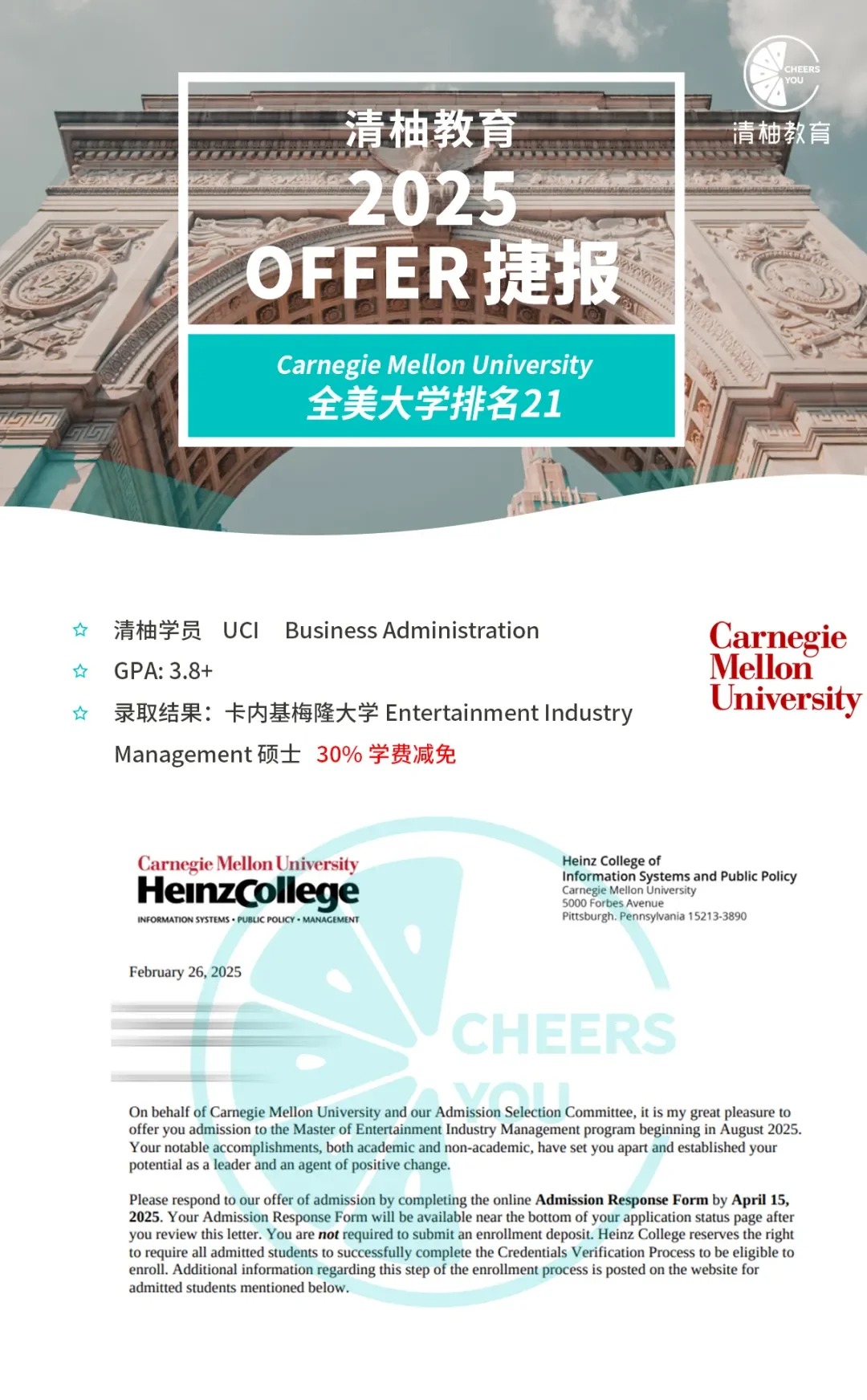 最终,在每年仅招收30人的项目里,Eunice成为了其中的一员,收获了卡内基梅隆大学娱乐产业管理项目的录取!