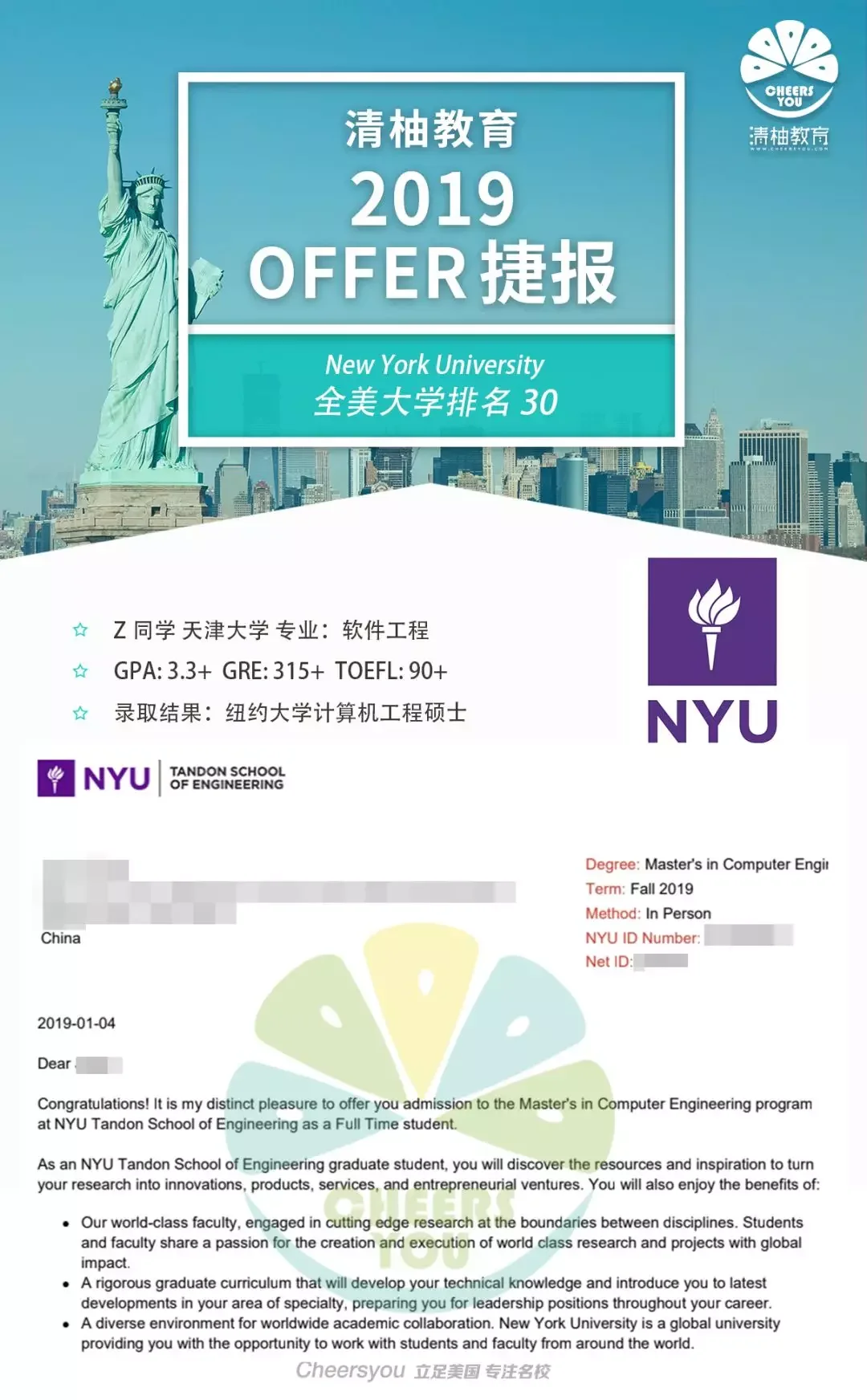 专业方面,Z同学一开始是想申CS,Eric根据Z同学的成绩给她做了细致的剖析,该学生的GPA、语言成绩都不高,CS近年来如此热门的项目,在众多申请者中我没有太大的优势。CS对Z同学来说申请难度太大,为了保险起见,建议CS+CE混申。选校方面,Z同学一心想去纽约大学,家长也希望能去纽大Tandon。清柚给出的选校方案是稳中求胜: 莱斯大学、纽约大学作为冲刺校;东北大学、乔治华盛顿大学作为正常申请。 最后的申请结果是,除了莱斯大学,剩下三所学校全部都收到了offer。