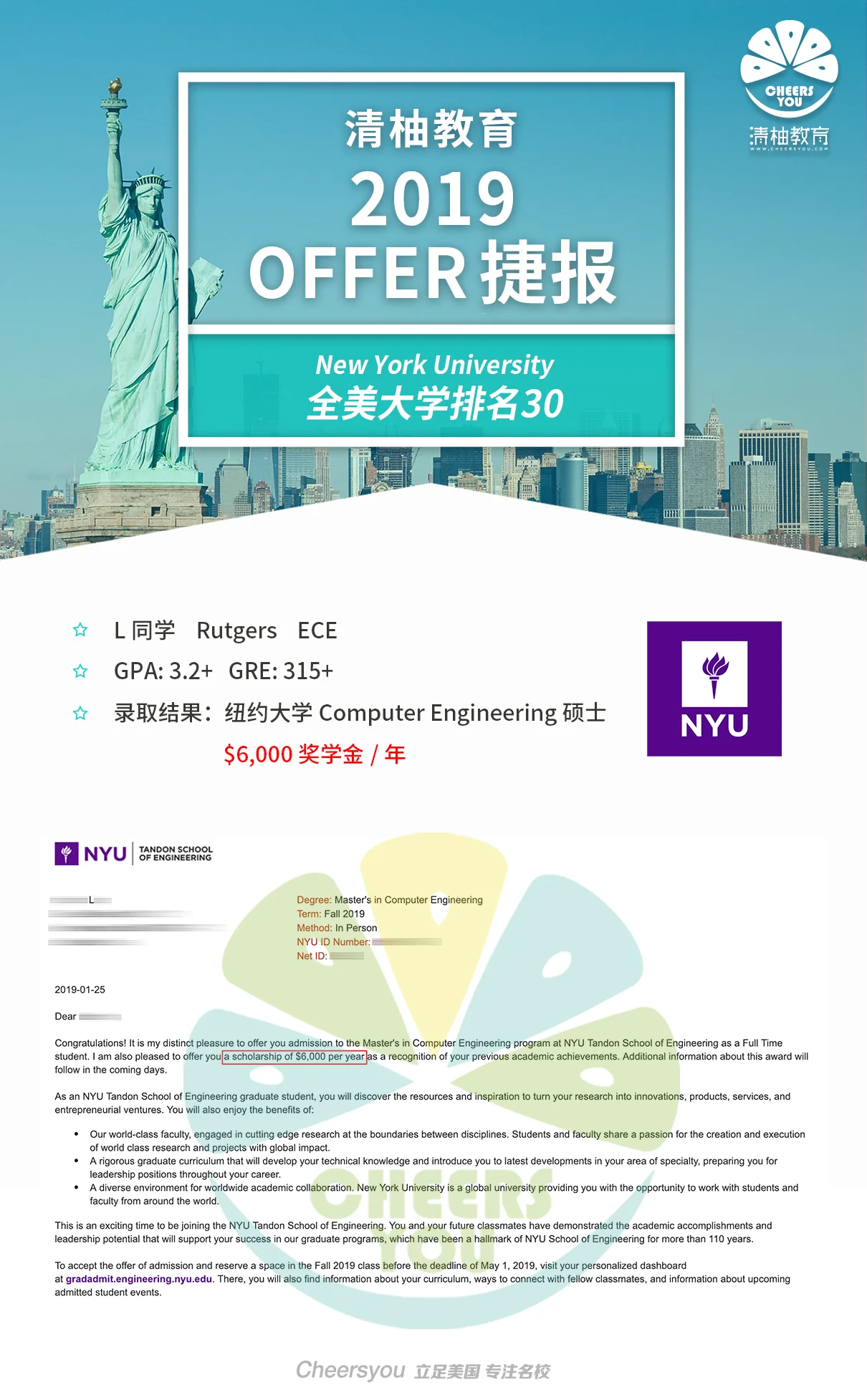 L同学绩点不高,一度怀疑申请能否合格,在清柚老师的鼓励和建议下,他在最后一学期的课程中,把GPA从3.1提高到了3.2+,给自己又争取了一线生机。