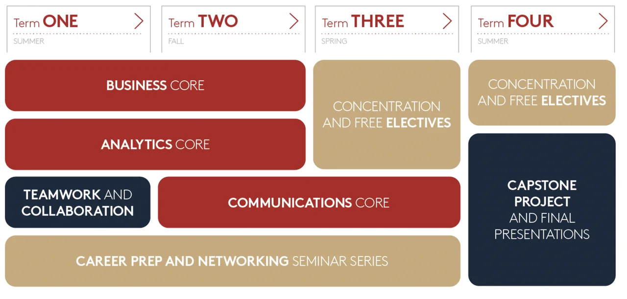 - 康奈尔大学的mba课程包括在线课程和住校课程。学生们将完成11门在线核心课程和6门在线选修课,其中包括金融分析、市场营销分析、运营和供应链分析以及商业分析。