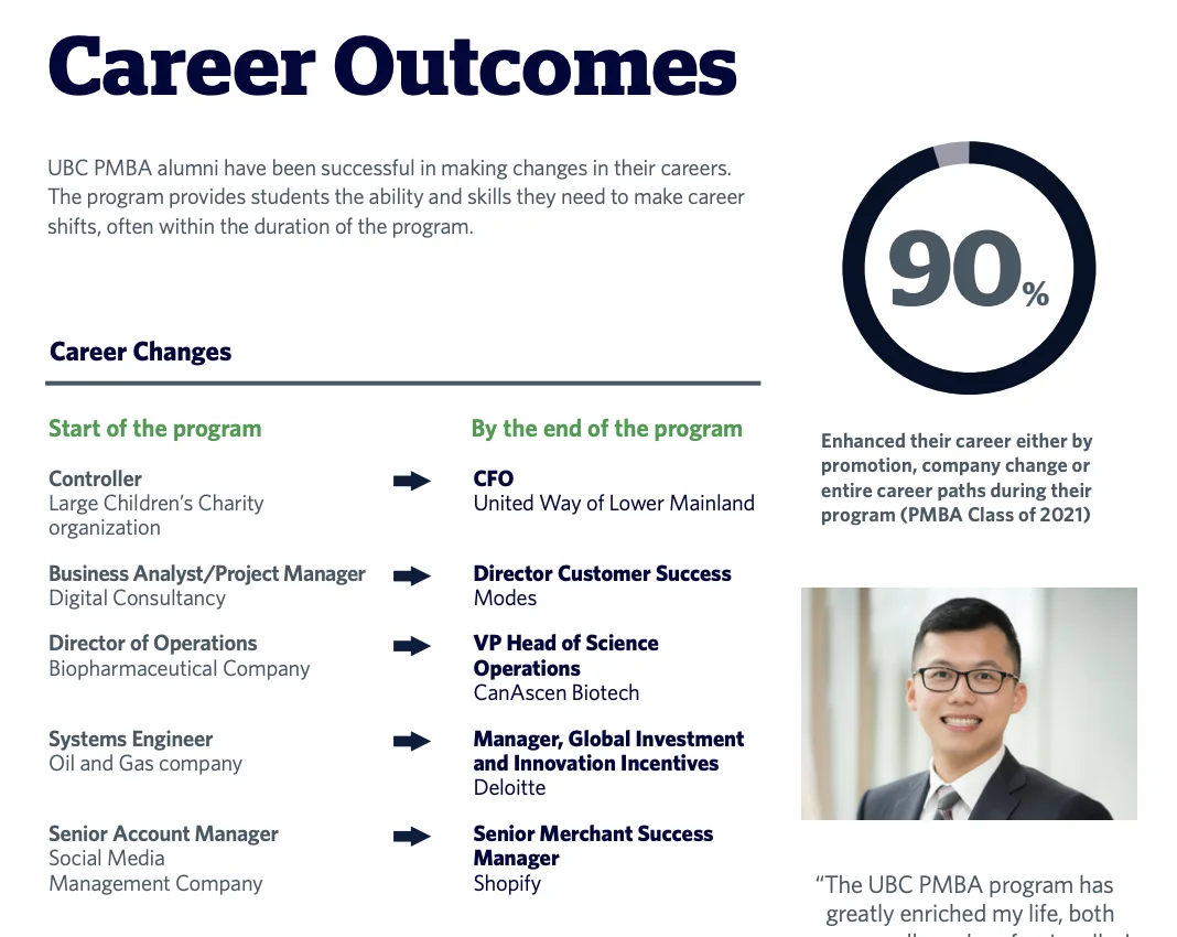 - 项目介绍:UBC Sauder的专业工商管理硕士(PMBA)项目是想要一个工商管理硕士,但不想失去职业动力的人的选择。24个月的课程可以适应学生的全职工作时间表,同时仍然具有挑战性。学生将加深对组织内部运作的理解,培养领导技能,建立商业头脑。