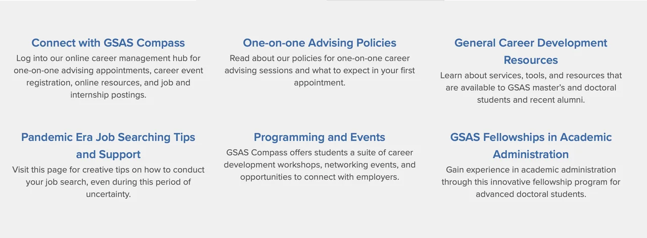 - GSAS Compass帮助艺术和科学专业的博士和硕士学生确定、努力并实现他们毕业后的职业目标。我们致力于创造一种包容的文化,鼓励探索,培养多样化的兴趣,并帮助GSAS学生为一系列非常适合他们个人技能、兴趣、价值观和个性的职业做好准备。最重要的是,我们使学生能够在他们追求的任何职业道路上利用他们的学术培训。