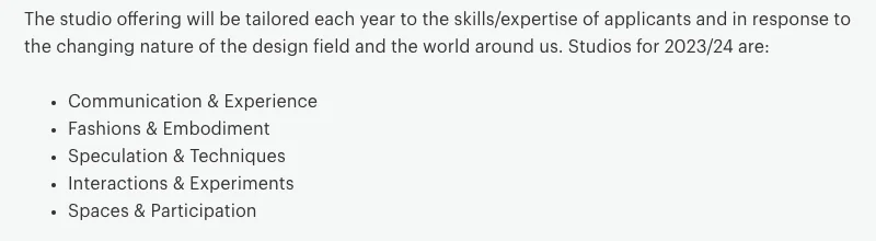 设计系共设有4个硕士研究生项目,其中MA Design: Expanded Practice这个项目为期5个学期,共15个月,学生拥有大量的工作室资源去学习自己感兴趣的领域和相关知识。