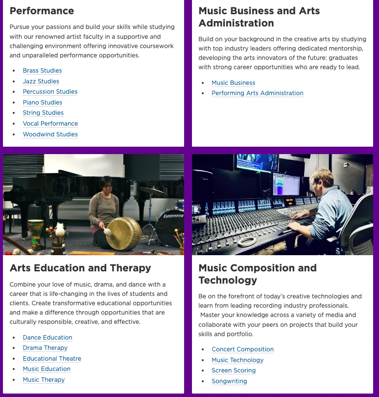 MPAP的项目主要分成四大类:表演、音乐商业和艺术管理、艺术教育与治疗、音乐创作与技术,具体项目如下: