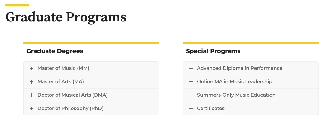 即MA,属于研究型学位,主攻方向为音乐创作和技能研究,文化与学术课程较多,需要学生具备很强的语言能力。学生可以选择创作或者音乐教育作为研究方向,具体专业方向如下: