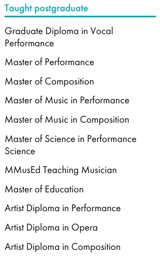 学院每年都为学生提供超过350个表演机会,确保学生能够获得丰富的职业和表演经验,并在此期间提升自己的能力,为未来的事业发展添砖加瓦。该学院共设有9个研究生项目: