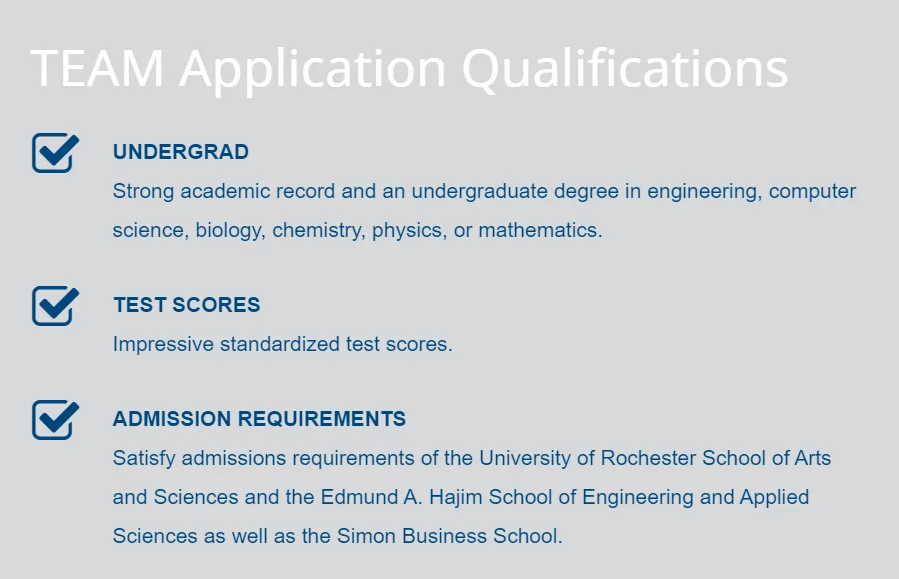 比如,罗切斯特大学的技术创业与管理项目(TEAM)由西蒙商学院和工程及应用科学学院联合开办,专为具有工程、科学或数学本科学位背景,想在研究生将技术与商业、企业管理和领导课程相结合的学生而设计。
