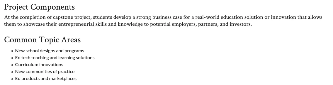 该项目主要面对的是在教育领域工作有多年经验积累,或者在教育行业有创业经历的人群,申请者需要有至少两年的相关工作经验。为期12个月的课程具有 Executive Style:每个月会安排几天进行集中授课,其余时间可以兼顾工作或者其他活动。项目总共需要修满10门课程,包括一个capstone project。