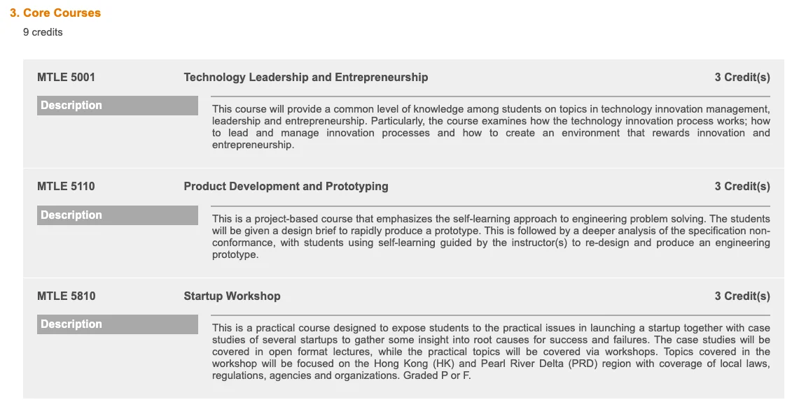 项目为期1.5年,学生需要完成30学分的学习,其中9分来自核心课程,6分来自技术或科学选修课、6分的创业选修课,以及9分的project。
