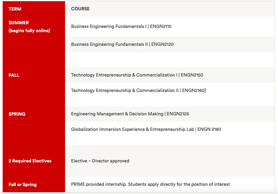 PRIME项目设立在布朗大学工学院下,学生将会在该项目中学习到如何使用新兴科技作为创造商业的价值和新企业的基础。该项目将教会学生如何在一个竞争激烈且发展迅速的市场中启动和发展基于科学技术的商业。