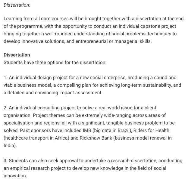 该项目的每位学生将有机会进行国际实地考察,与发展中国家的非政府组织或公司一起进行研究,获得面对全球不同社区所面临的各种问题的第一手经验。项目为期12个月,包含四门核心课程:Understanding Social Problems for Innovation and Entrepreneurship、Social Innovation Design、Organisational Behaviour and Marketing for Social Entrepreneurs、以及Managerial Economics and Quantitative Measurement for Social Entrepreneurs。