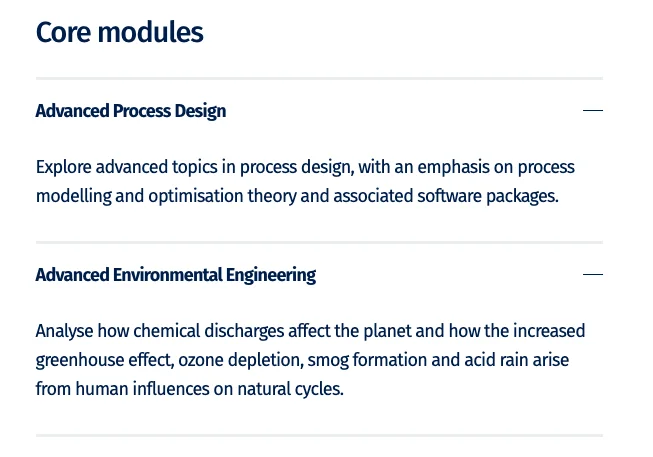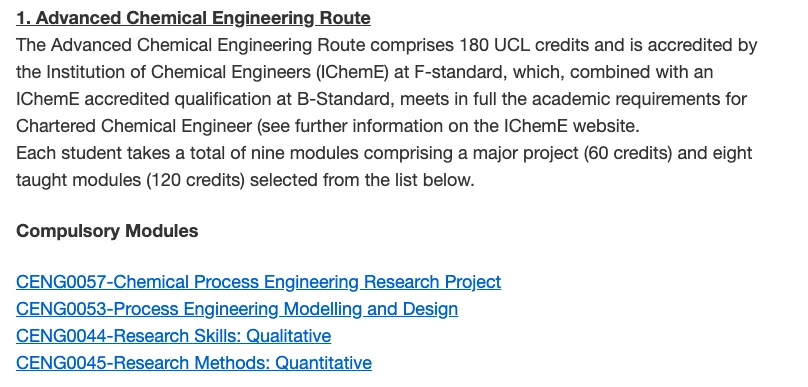 • 这个项目分为两个分支:Advanced Chemical Engineering和Research,不同分支的课程会有所不同,其中Research Route更适合本科就读于化学工程专业或其他相似专业的学生