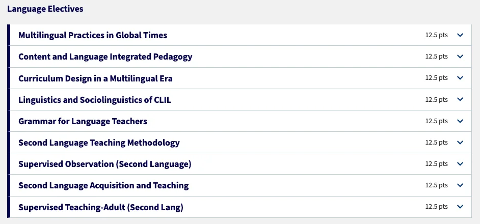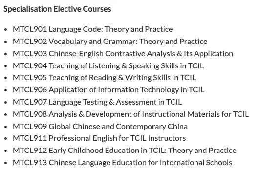 其中Master of Modern Languages Education这个项目,为期两年,学生需要完成200学分的学习。这个项目除了必修的:Understanding the Student as Learner、Research in Educational Relationships、Understanding Education in Context和Local Literacies in Global Contexts这四门课程之外,还有涵盖了11个不同领域的选修课,包括与语言相关的选修课: