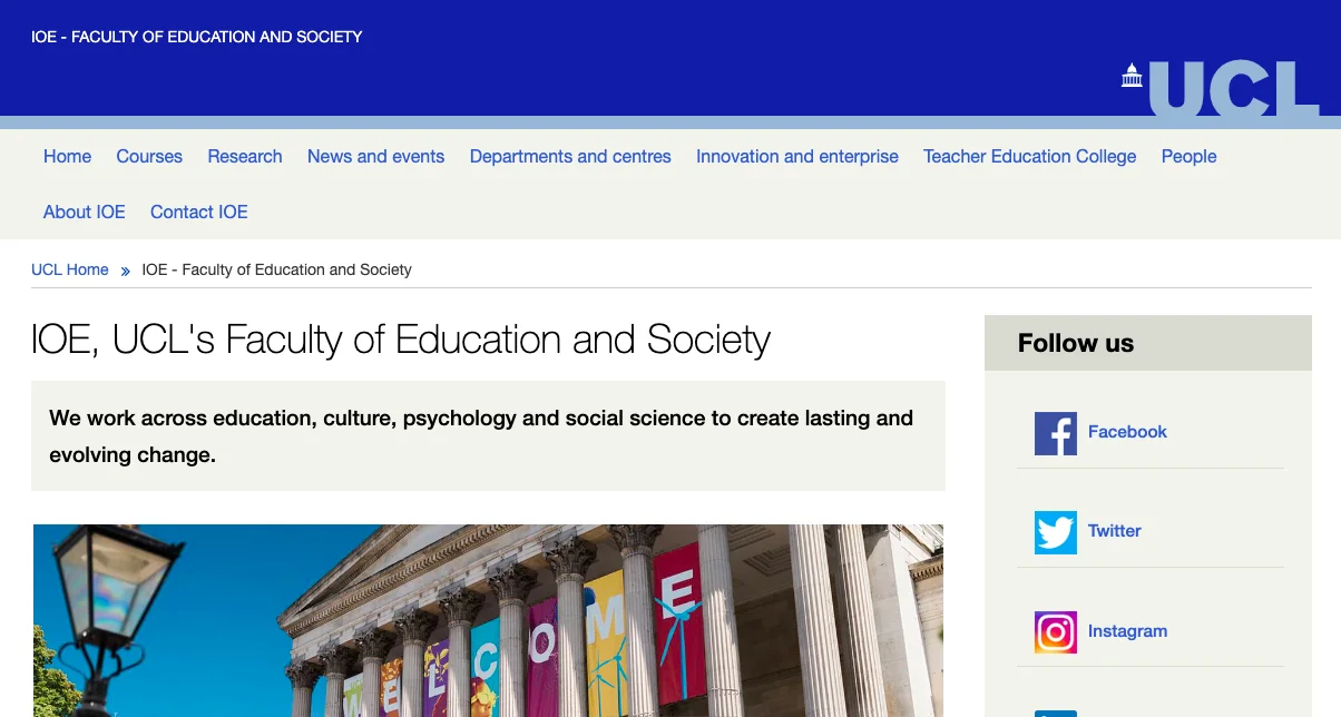 伦敦大学学院的教育学院(后由UCL Institute of Education改名为UCL's Faculty of Education and Society)自2014年起就坐稳QS教育专业排名第一名的位置,有超过1500名教师和4000名硕士研究生。