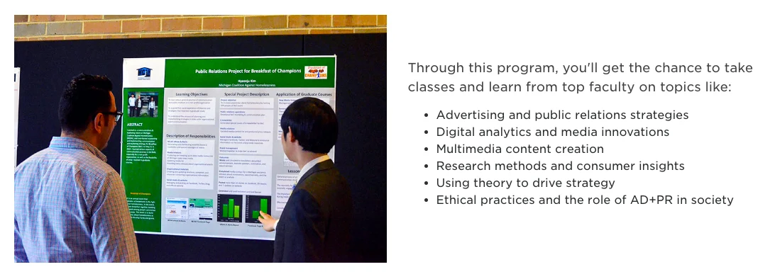 项目分两种模式,一种是论文式的,一种是考试式的,两种模式都需要修五门课,分别是广告与公共关系理论、广告和公共关系中的道德实践、广告与公共关系策略、多媒体内容创作、基础定量研究方法。另外,PRSSA(The Public Relations Student Society of America)在MSU有设一个点,这个协会可以帮助学生积累真正的相关经验。