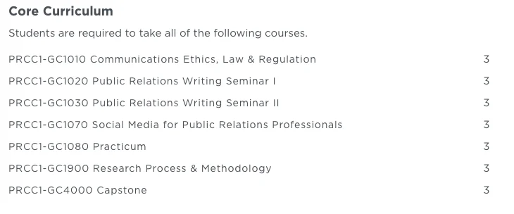 项目需要学生完成42学分的学习,核心课程共7门,例如新闻媒介关系管理、公共关系写作、市场营销策略与危机处理策略等,其中也包括一些基础课程,例如公关理论与发展史、公关法律法规等。如果你本科是公关专业,且已经学了很多有关公关的基础课程,希望在研究生阶段可以就某一研究领域深造的话,NYU的公共关系与企业传媒是值得考虑的。