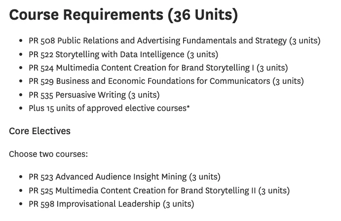 其基础课程包括公关研究与评估、策略公共关系导论、策略公共关系管理、公关案例讨论、公共关系写作等。从课程设置上看,南加州的这个PR课程是能让学生学习到很多实际中所遇到公关问题的解决方案的。