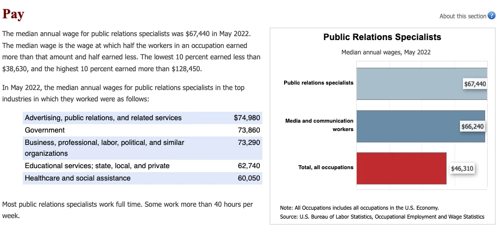 根据美国劳动统计局最新公布数据预计在2022-2032年,公共关系职业增长是6%,是所有职业的平均增长的两倍。2022年公共关系专员的年薪中位数是$67,440。在广告业、政府机构及部分行业里,他们的年薪中位数都在73k以上。