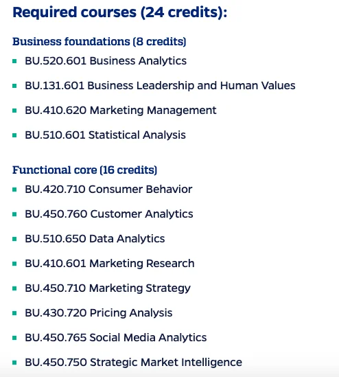JHU的市场营销理学硕士课程旨在让学生研究市场营销行业的当前和未来趋势,利用所学知识解决大小型组织面临的现实难题。必修课包含了商业基础课程和核心实用课程两部分,除了打好学生MKT理论基础,也培养学生市场分析、营销管理方面的实际应用。