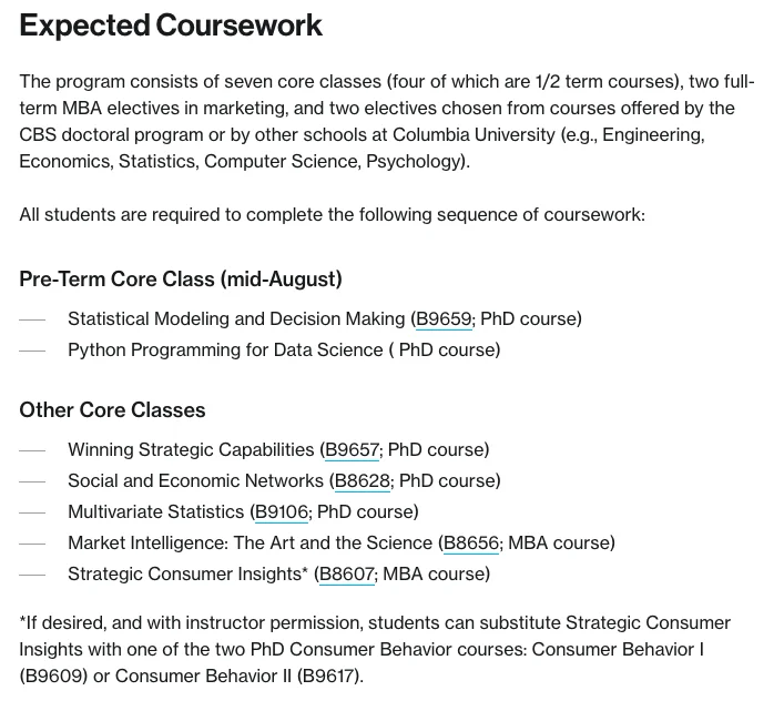 该项目要求学生必须完成至少十门完整的研究生程度课程(30学分):7门核心课程,2门市场营销MBA课程以及至少2门博士选修课(工程、经济学、统计学、计算机科学、心理学等)。从核心课程的安排上,我们也不难看出这个项目非常注重培养学生的分析和统计能力。