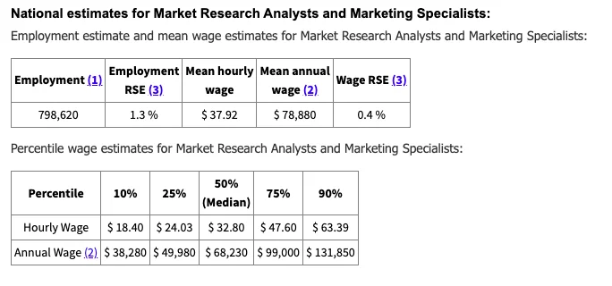 据美国劳工统计处的数据显示,市场分析师/市场专员的平均年薪大约为$78,880,中位数为$68,230。