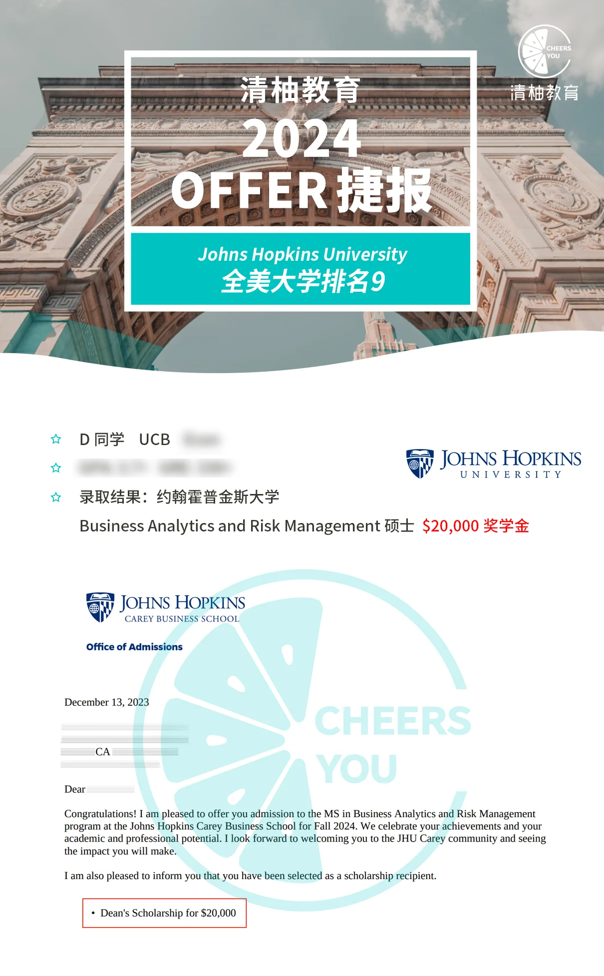 约翰霍普金斯大学Business Analytics and Risk Management硕士录取!$20,000奖学金!