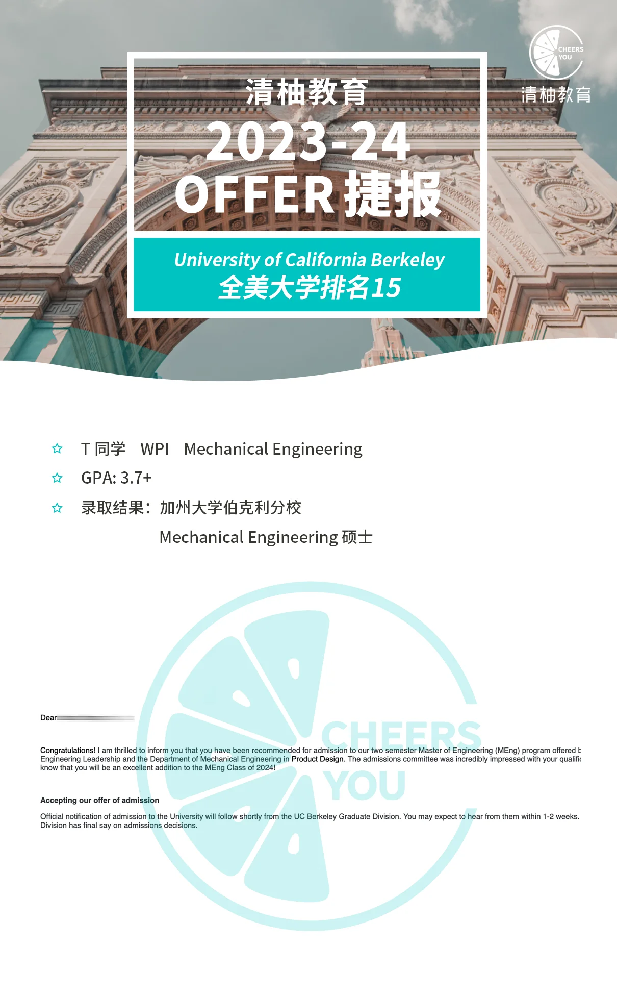 清柚老师不仅帮助Alex分析了各个项目的特点和优势,更为他量身定制了一份申请计划。当清柚老师向他推荐申请UCB机械工程的时候,Alex第一反应竟是:我的背景也能申请这样的顶尖学校吗?