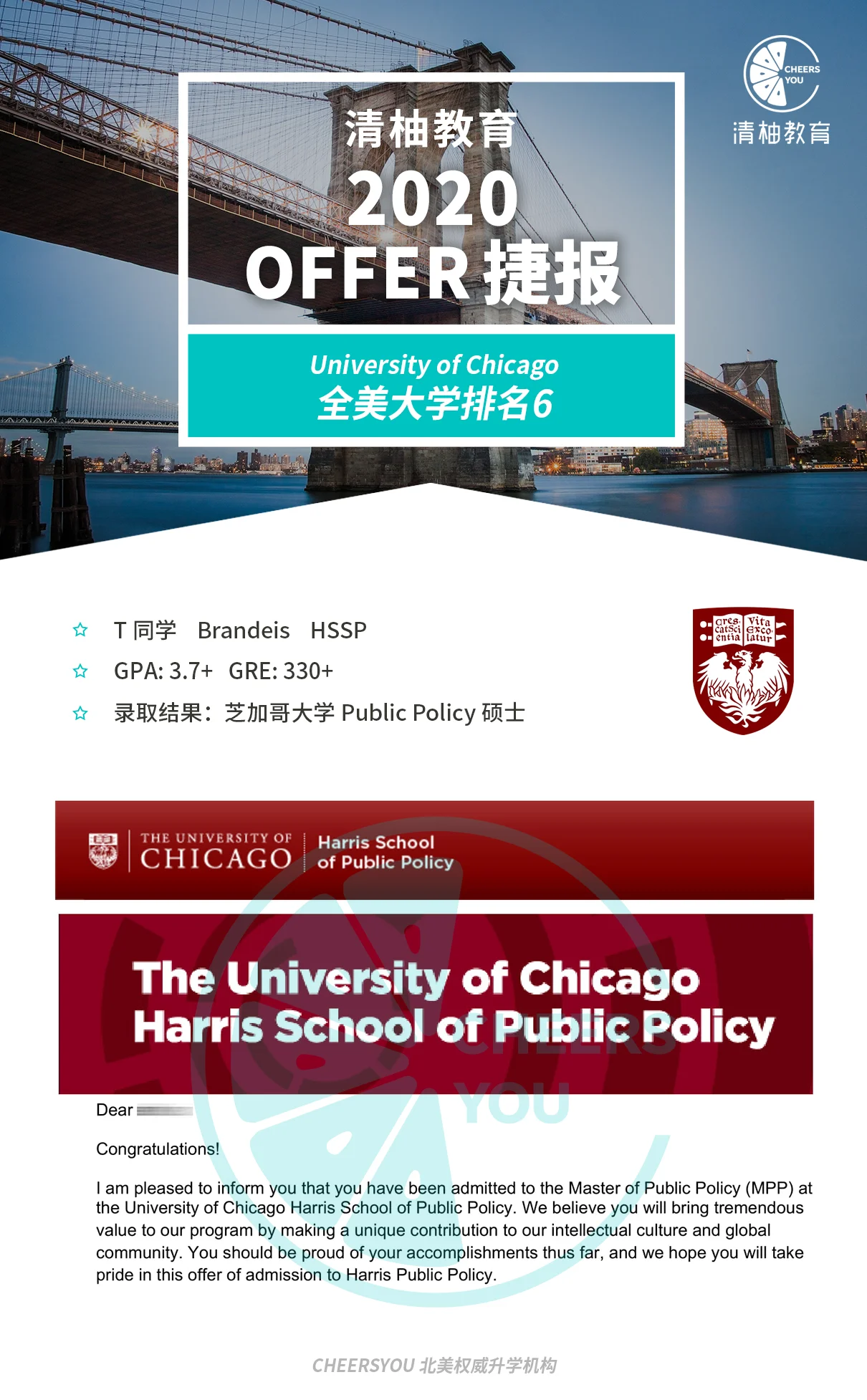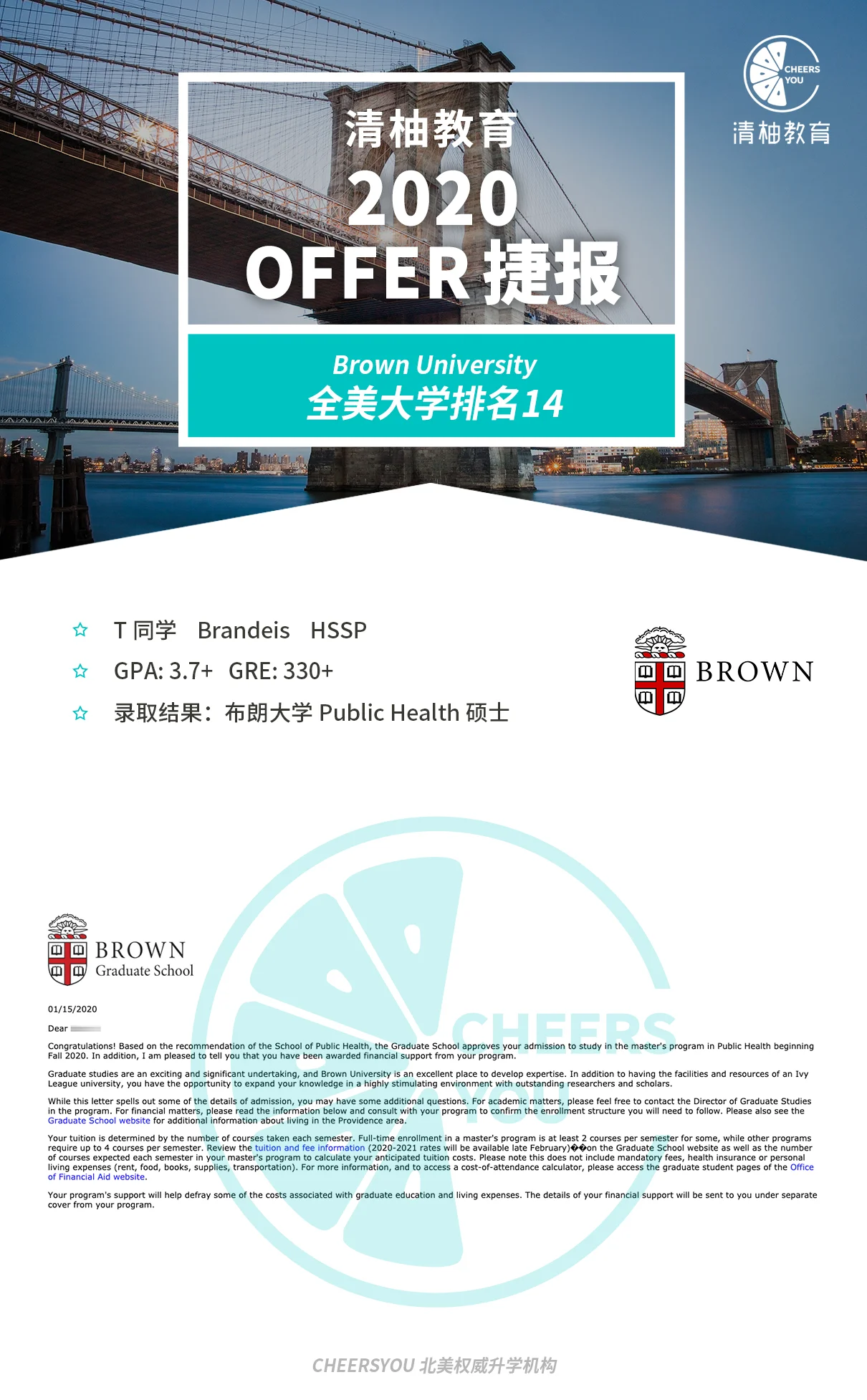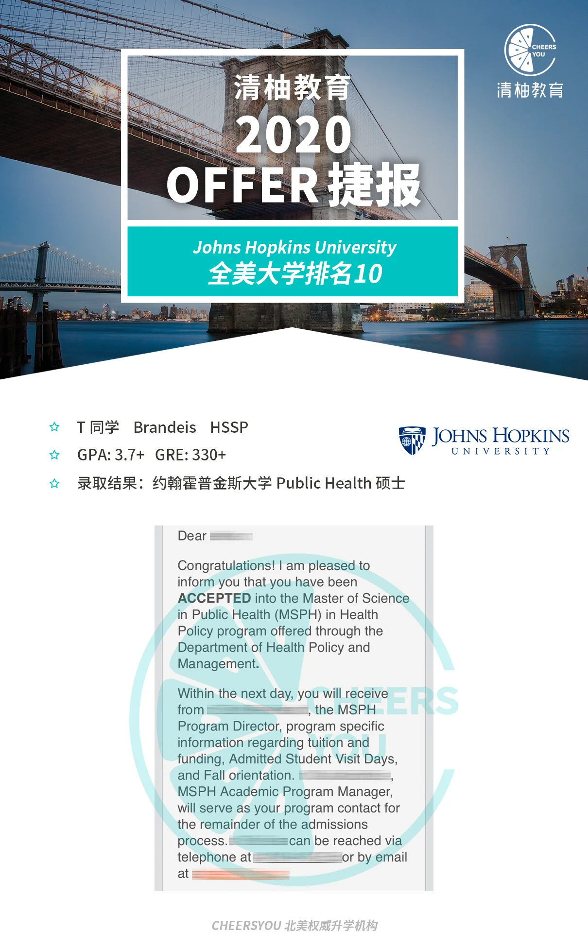 经历了最后的面试大关,专排第一的约翰霍普金斯大学、布朗纽大MPH、芝大MPP都向我投来了橄榄枝。这样喜人的成绩是自己努力的证明,也离不开清柚共同的帮助。