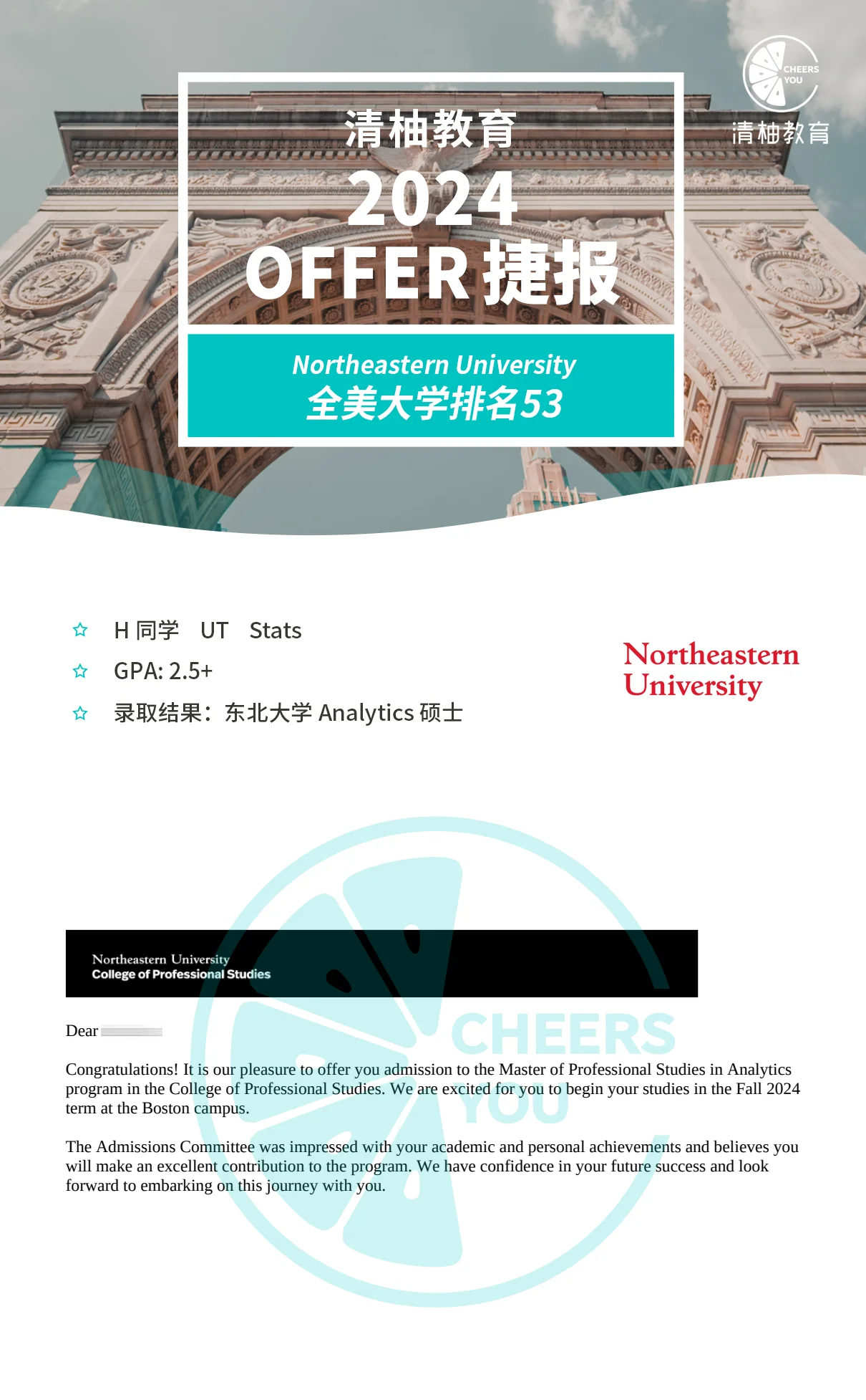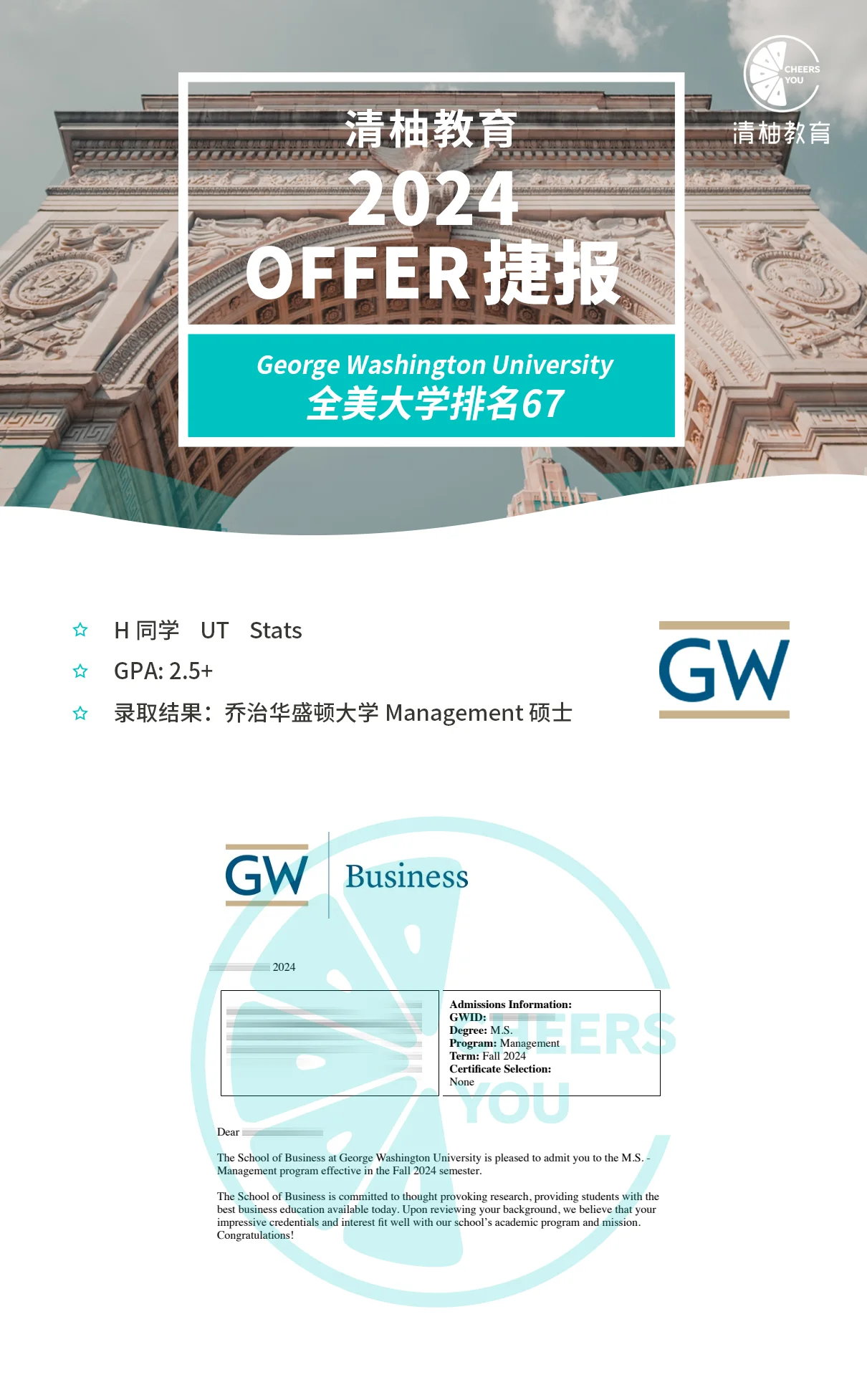 最终,Haley成功逆袭,连续拿下NEU, USF, GWU在内的名校offer。