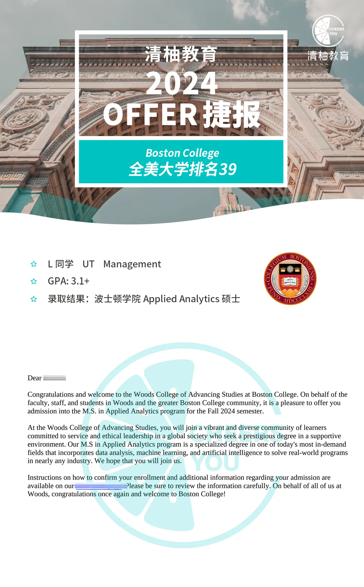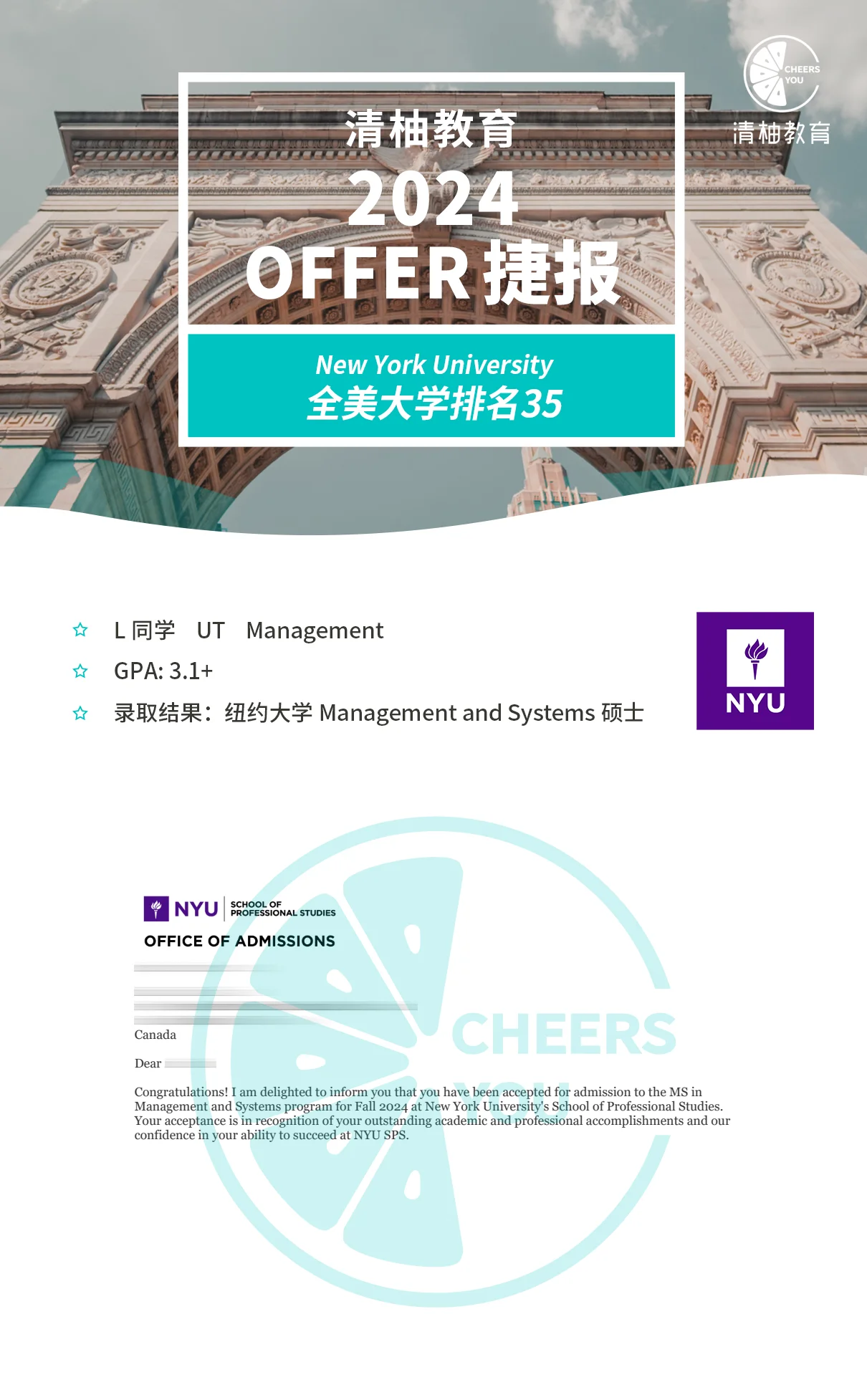 虽然无GRE, 也无较高的GPA,但在Henry和清柚老师的不断努力之下,名校offer终于接踵而至。