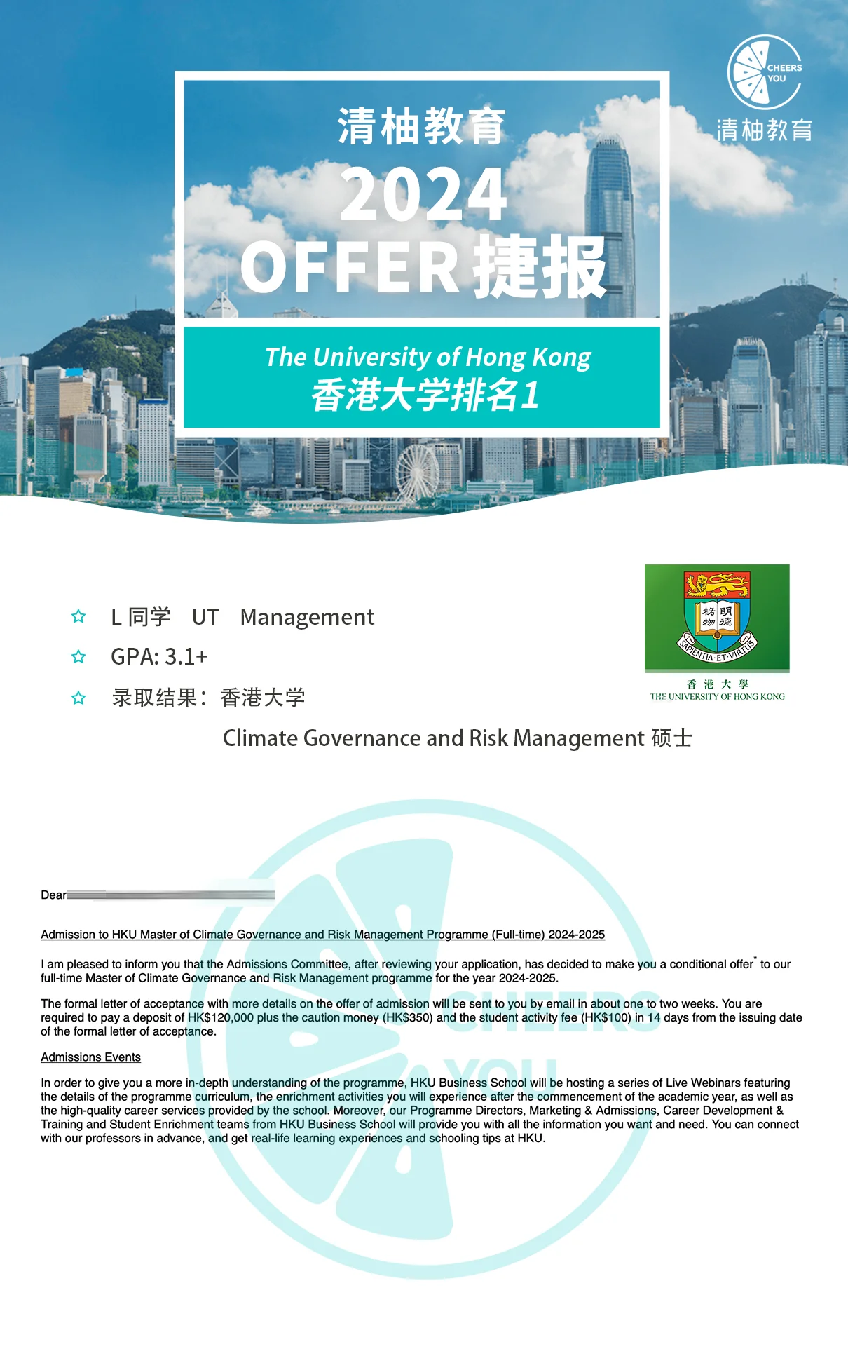 像香港大学2024年秋季新开的Climate Governance and Risk Management硕士项目,也成为了他选校清单上一个契合度超高的选择。