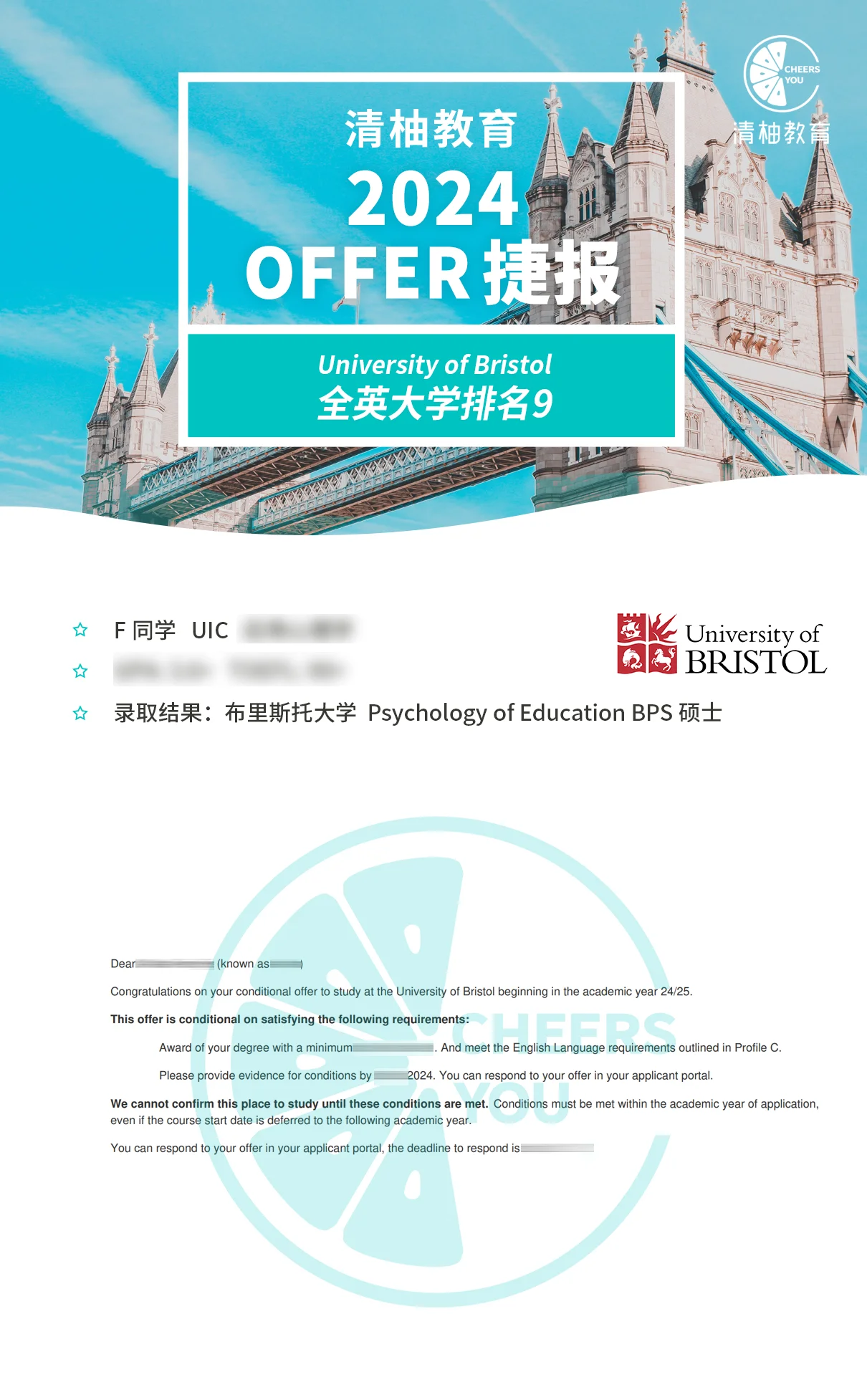 布里斯托大学Psychology of Education硕士录取!