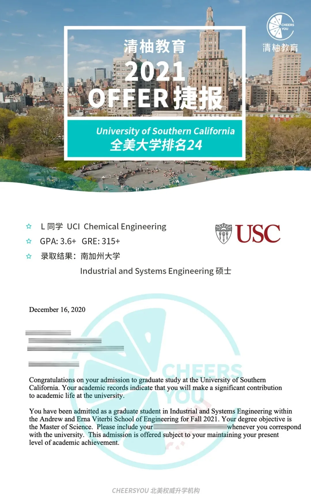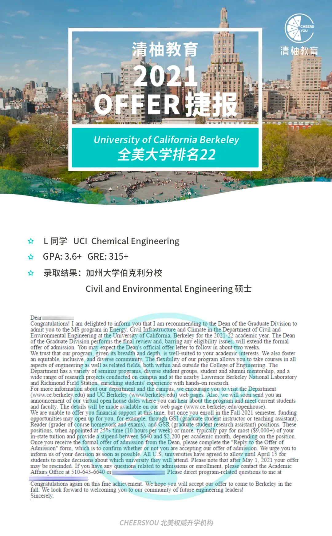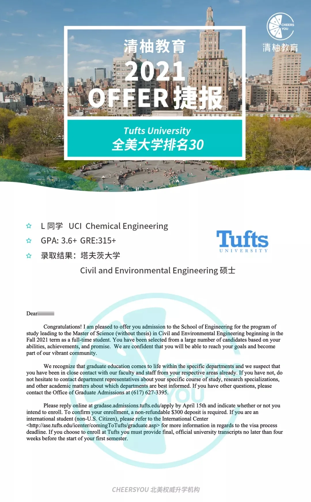 录取:加州大学伯克利分校Civil and Environmental Engineering硕士、卡内基梅隆大学 Civil and Environmental Engineering硕士 $24,250奖学金、南加州大学Industrial and Systems Engineering硕士、塔夫茨大学Civil & Environmental Engineering硕士、纽约大学、加州大学尔湾分校等