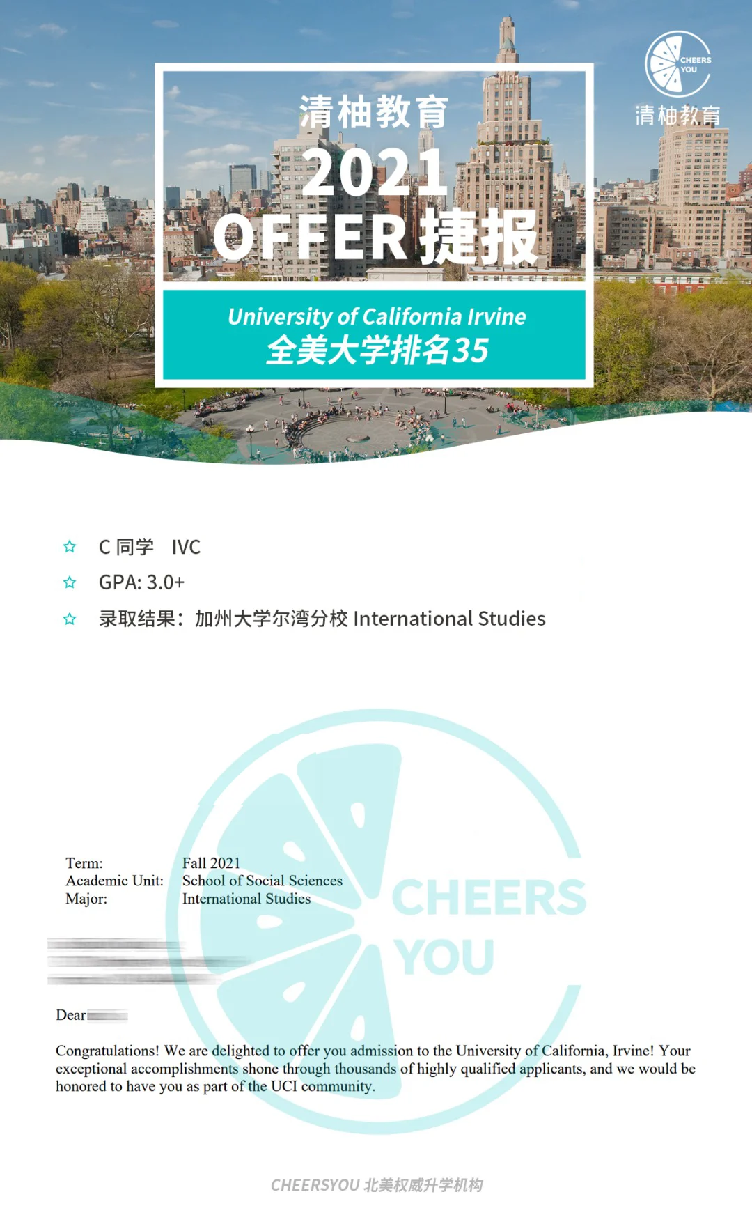 录取学校:加州大学尔湾分校International Studies,加州大学河滨分校,等