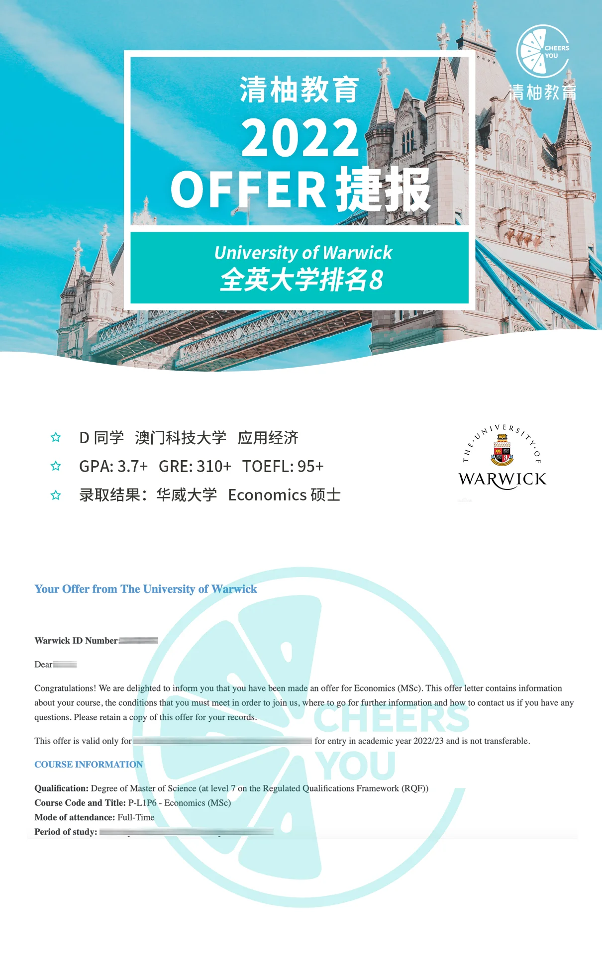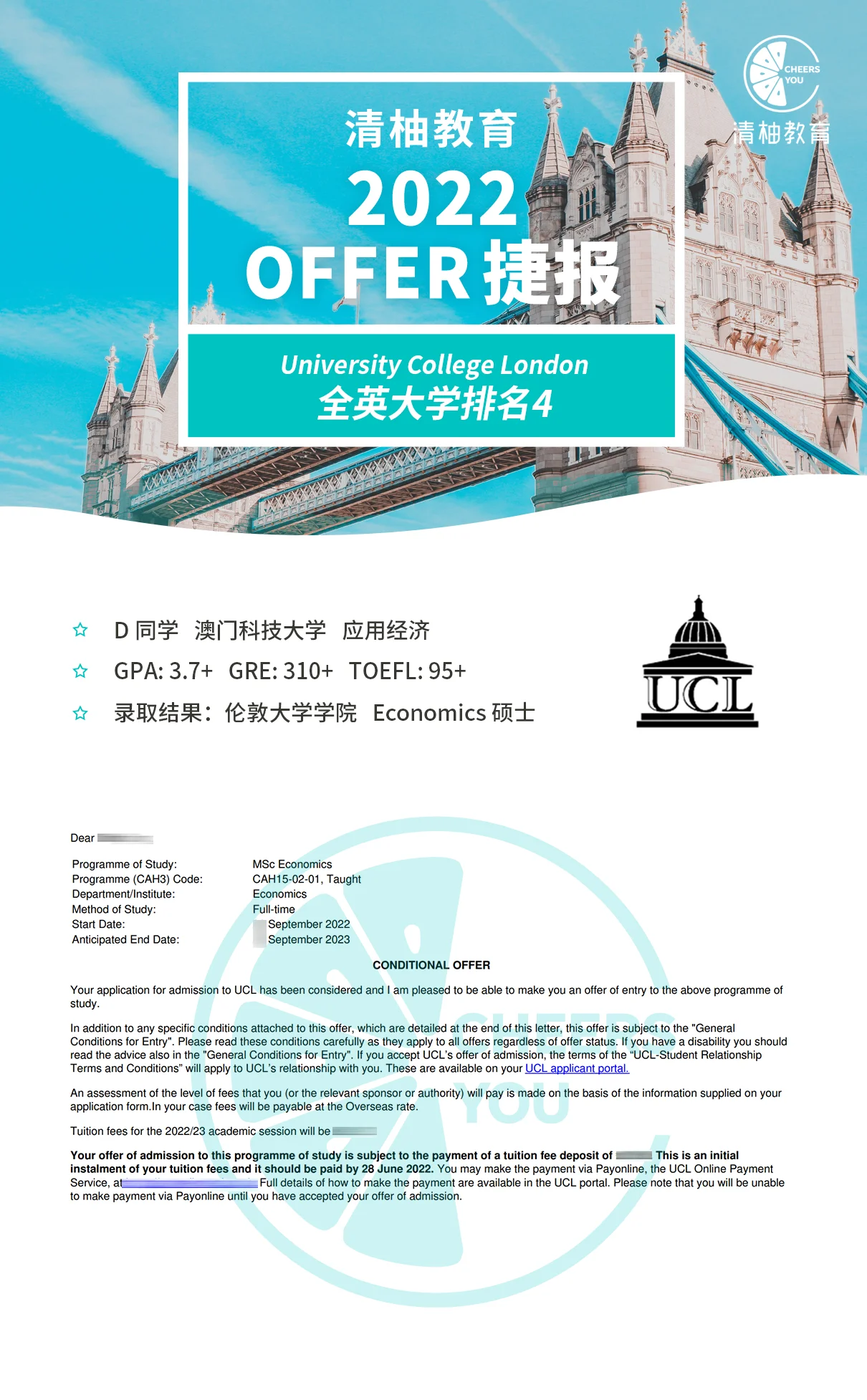 录取:伦敦大学学院Economics硕士,华威大学Economics硕士等