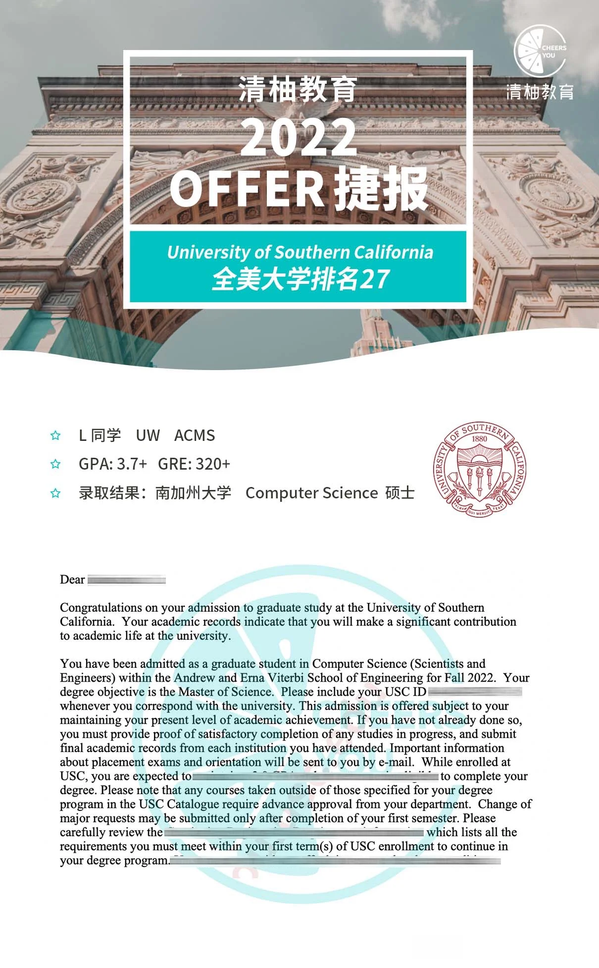 让Aiden没想到的是,他最先收到的是芝加哥大学CS的offer。而随之而来的,同样是CS方向南加州大学的录取。