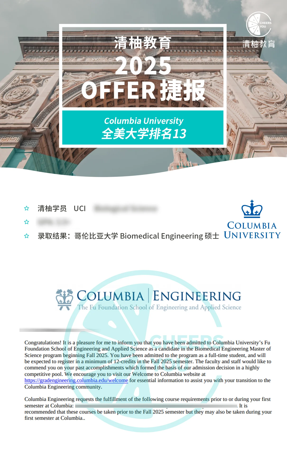 哥伦比亚大学Biomedical Engineering硕士录取!