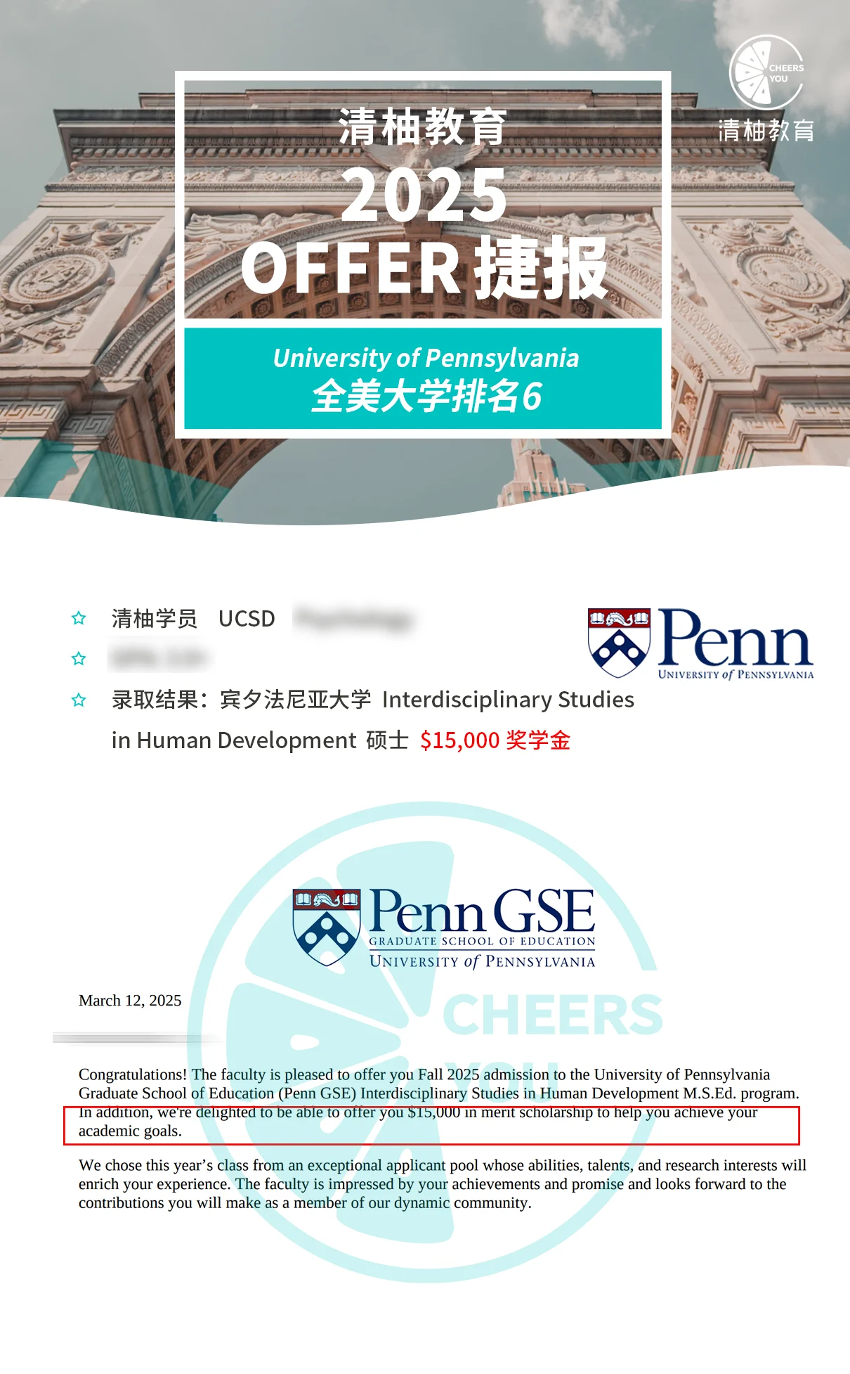 宾夕法尼亚大学Interdisciplinary Studies in Human Development硕士录取!$15,000奖学金!