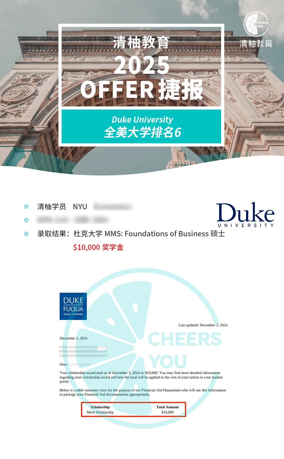 杜克大学MMS: Foundations of Business硕士录取!$10,000奖学金!