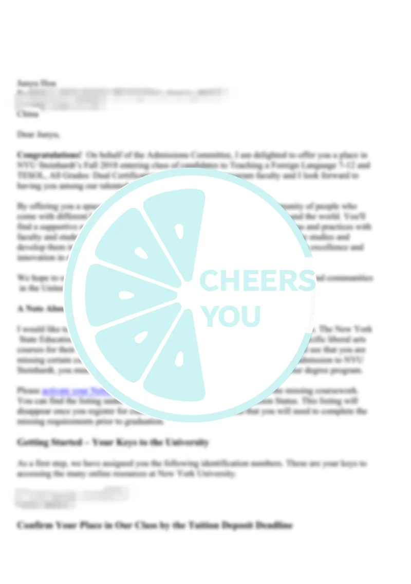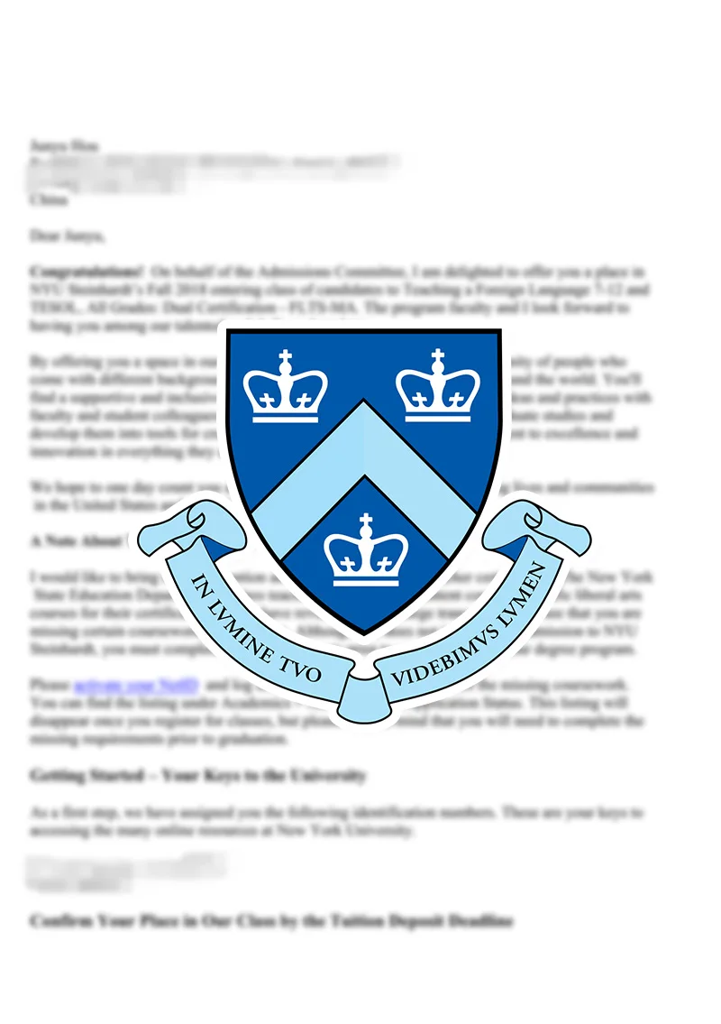 还好有清柚教育的帮助,当时我已经忙作业忙懵了,匆忙找了清柚,立刻给我找了同方向的大牛申请老师,一路走来非常顺利,去到了最想去的学校,感谢!