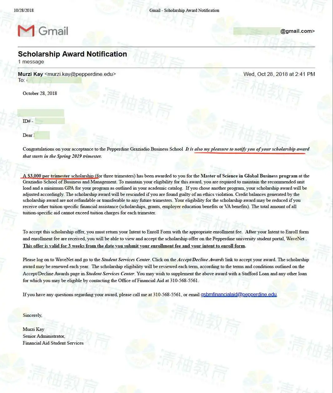 我从来不曾想象,没有GRE/GMAT成绩,我成功进了商学院,还拿到了每学期3000的奖学金,感谢清柚对我的全力支持。