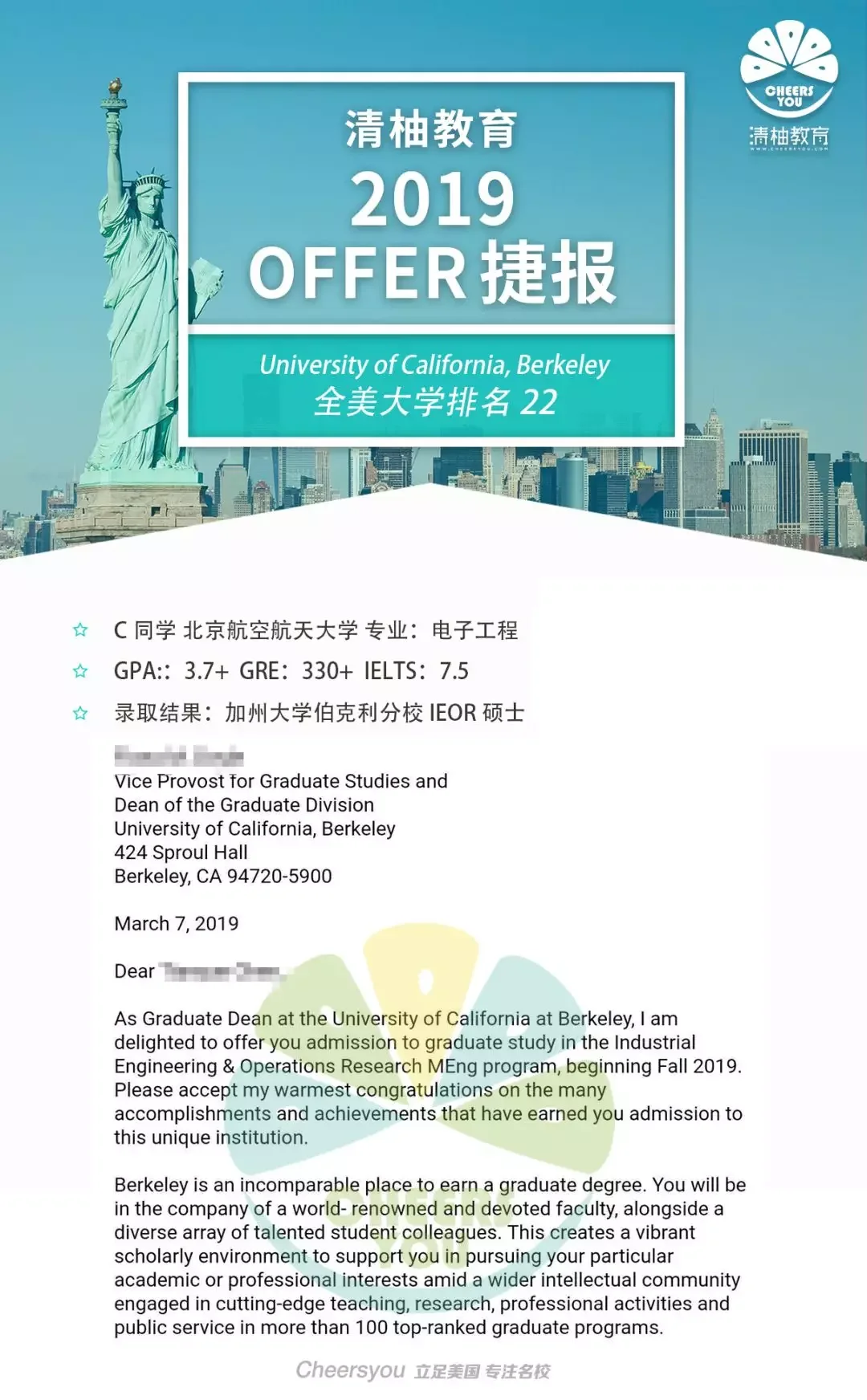 对于研究生申请,C同学跟其他同学有些不一样,她做足了软件和硬件的准备,每天在各大留学论坛上收集资料,分析对比自己的情况。但数据太多难辨真假,清柚的顾问老师帮C同学理清思路,分析利弊,确定以OR(运筹学)作为转专业申请的主要方向。关于转专业,其实C同学并不是很自信,曾一度沮丧消极,Eric耐心劝慰C同学,转专业机会人人平等,如果可以帮助你拓宽知识眼界,发挥你个人兴趣,那就可以放心的去申,最终C同学选择了UCB和Cornell的项目,在一大堆本专业的offer中,C同学最后获得伯克利大学offer!