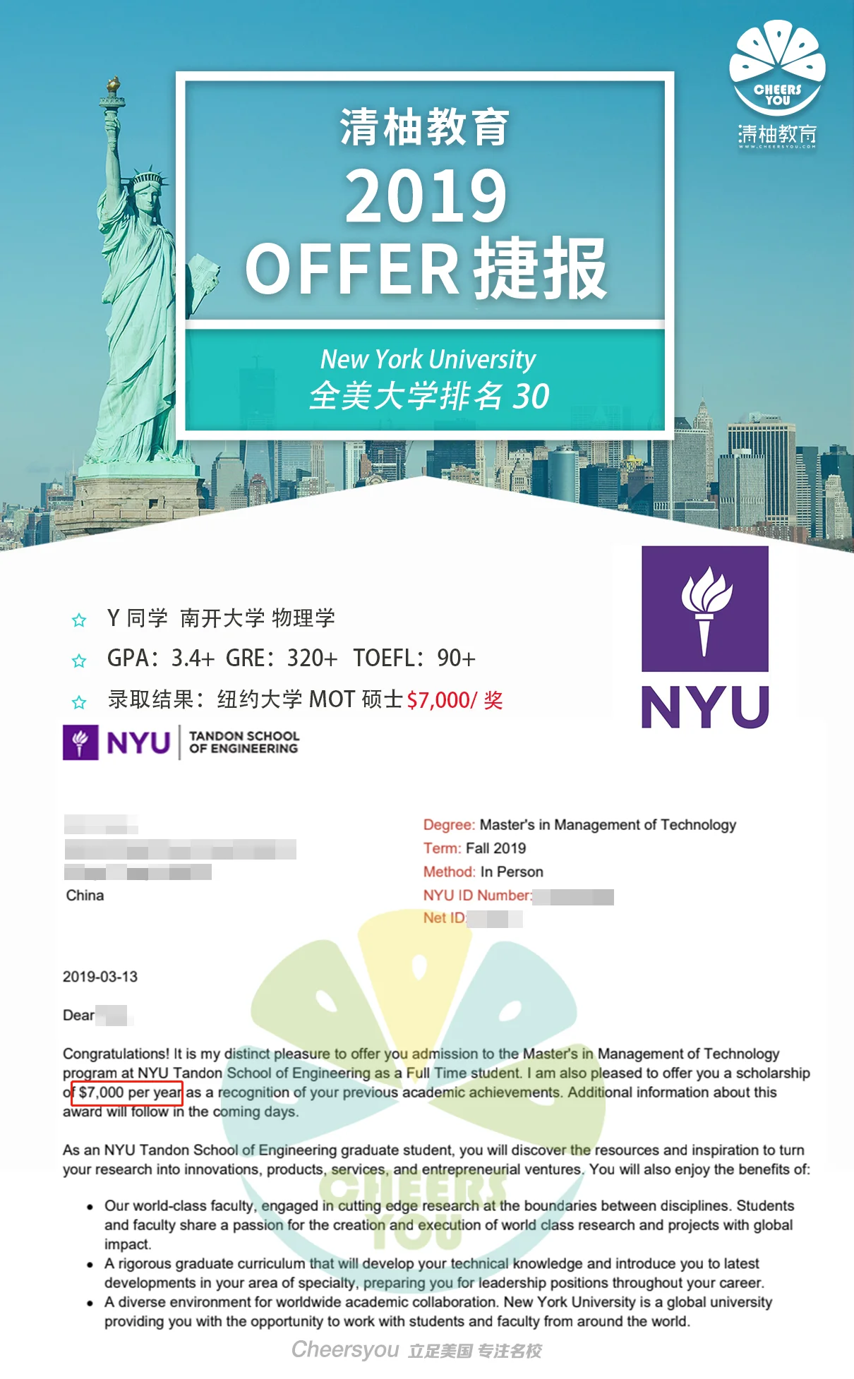 Y同学大学专业为物理学,但并不满足一个方向,想要多方向发展学习,大二寒假时参加了北美数学建模大赛担任团队leader,自学过很多建模思想和对应算法,也跟随导师参与过商科的市创项目、Citibank的YTP项目,Y同学认识到自己对商科和数据的喜爱,研究生想转专业读商科或者工科,但Y同学成绩一般,尤其是托福成绩,经过多次考试最后考出来勉强能用于申请的分数,93分,GPA和GRE也没有取得特别有竞争力的成绩,找到清柚后,Y同学跟Eric说非常想去纽约大学,清柚马上开始为Y同学进行申请准备。