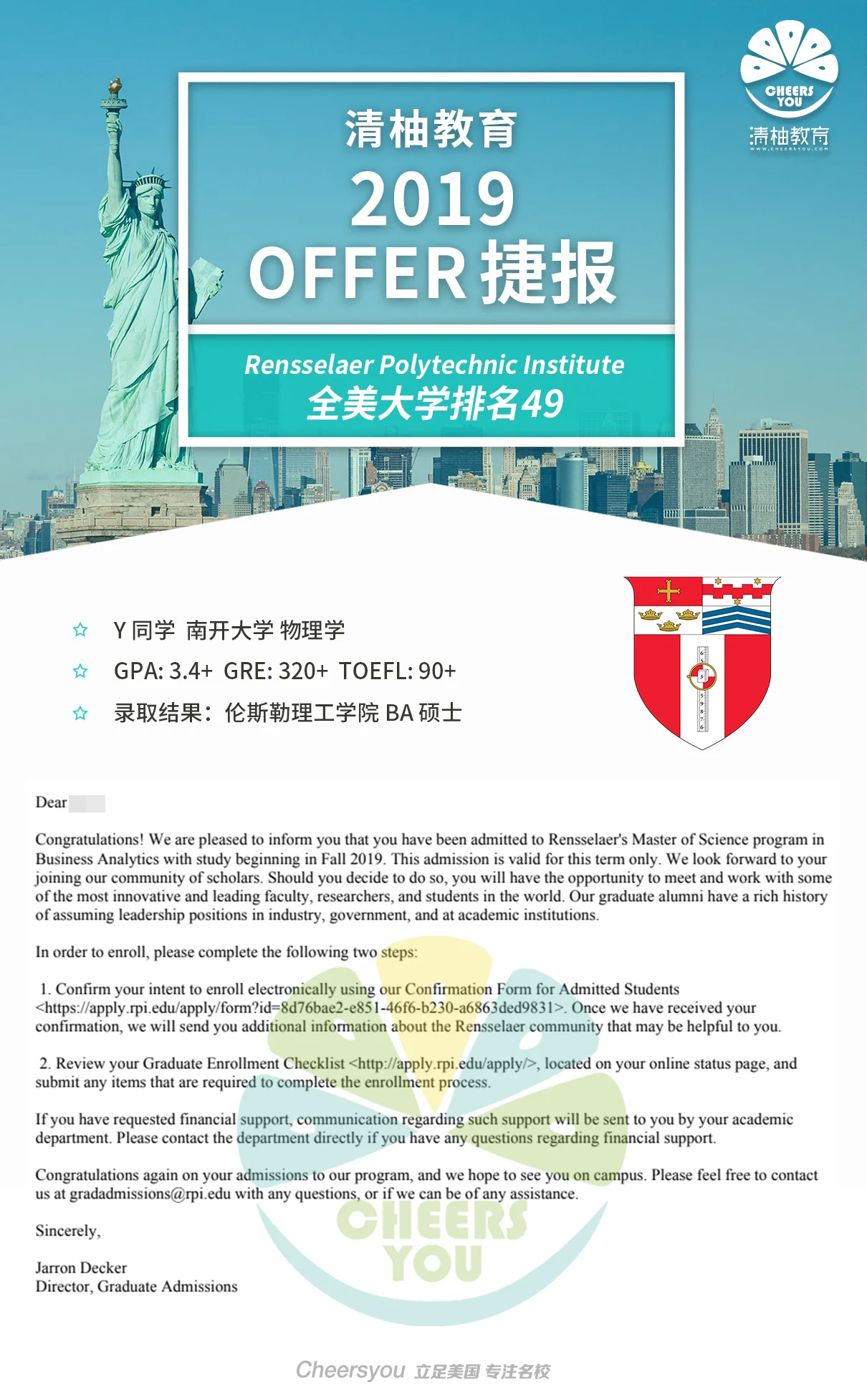 最后,Y同学收获了NYU MOT 硕士 $7,000奖/年 、RPI BA 硕士、BU Applied BA 硕士、CWR Mgmt in BA 硕士 $10,000奖学金 offer!
