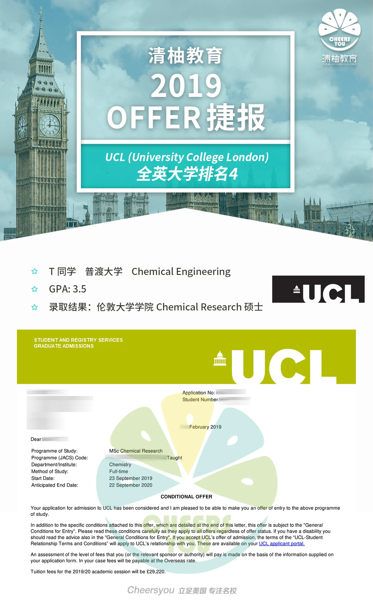 刚好由于当初做research的时候,有个关系不错的同学是英国人,也让T同学萌生了去英国深造的想法。英国的化学专业也有数百年的历史,T同学也希望能在英国有一个全新的学习研究体验。申请方向上,T同学发现自己还是偏research人才,于是想找以research为主的化学专业。像UCL的化学研究他之前也做过调查,发现课程设置紧凑,大多数时间还能与导师一对一交流,因此UCL的该项目也成为了他的申请首选。