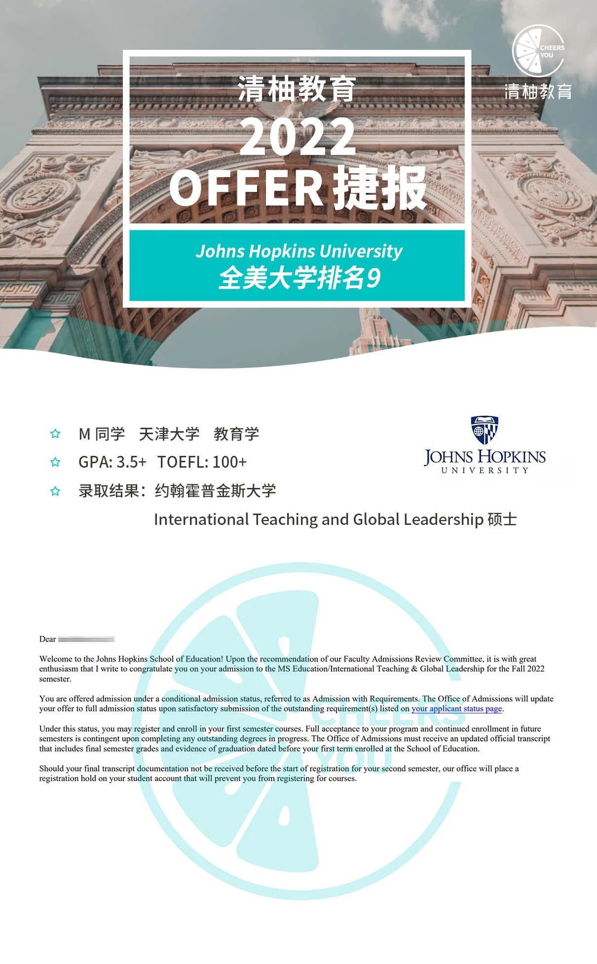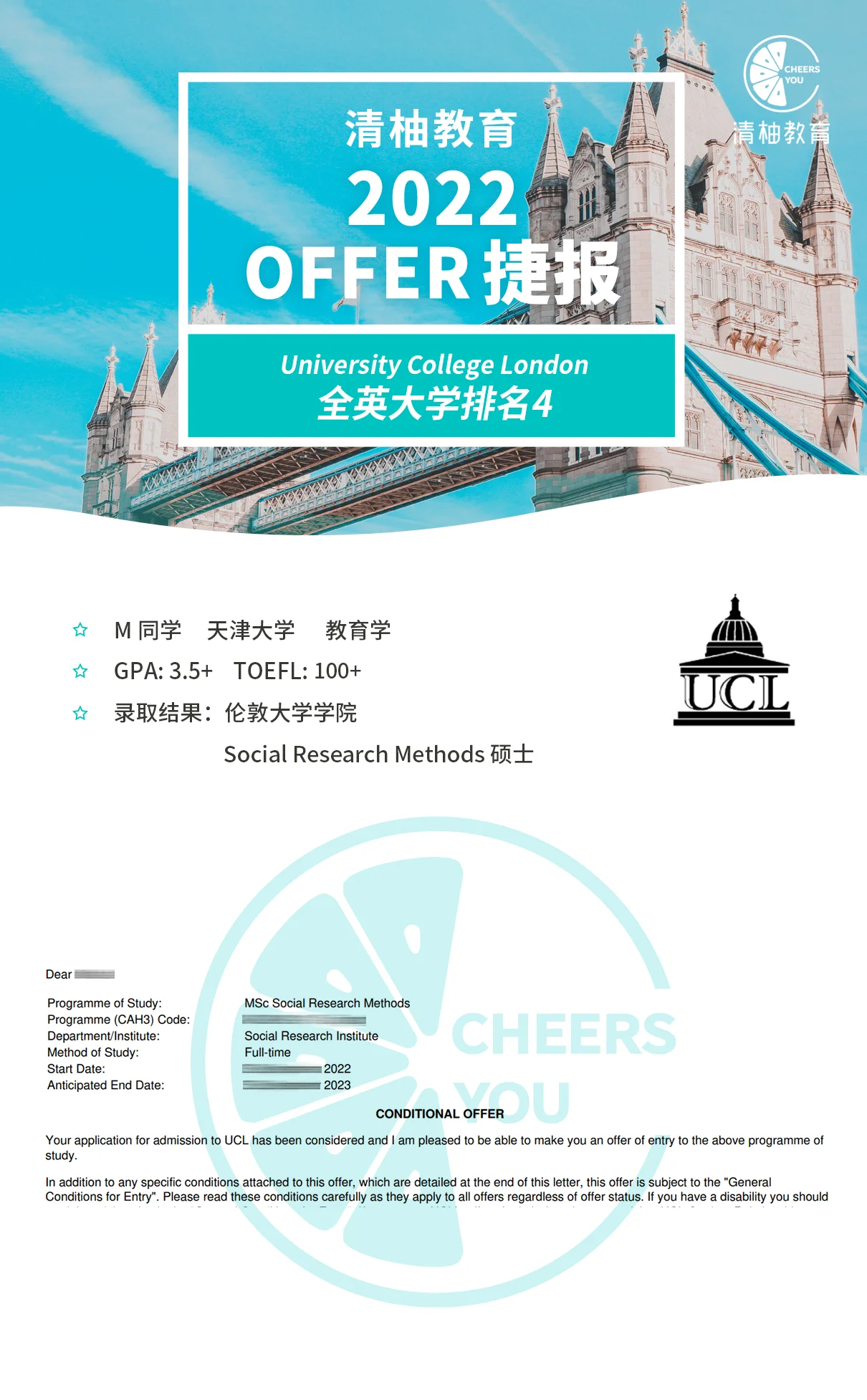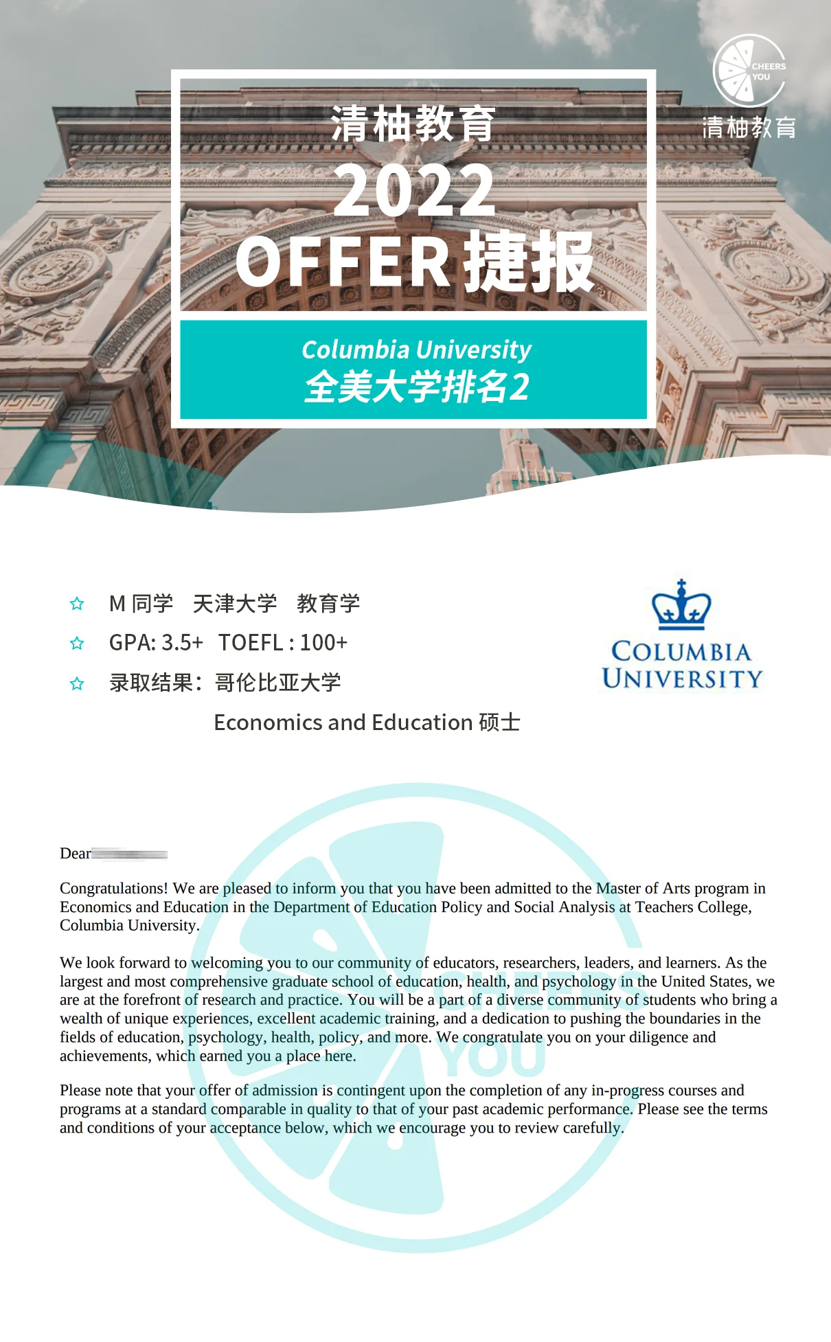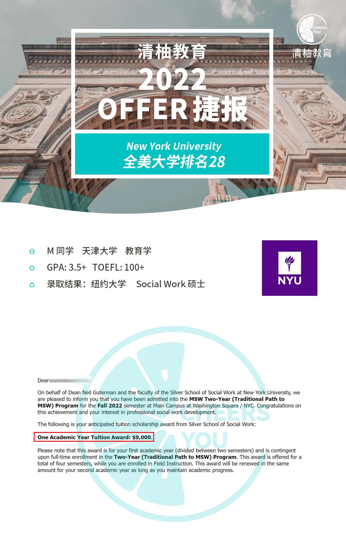 录取院校:哥伦比亚大学Economics and Education硕士,伦敦大学学院Social Research Methods硕士,约翰霍普金斯大学ITGL硕士,纽约大学Social Work硕士 $9,000/学年奖学金等