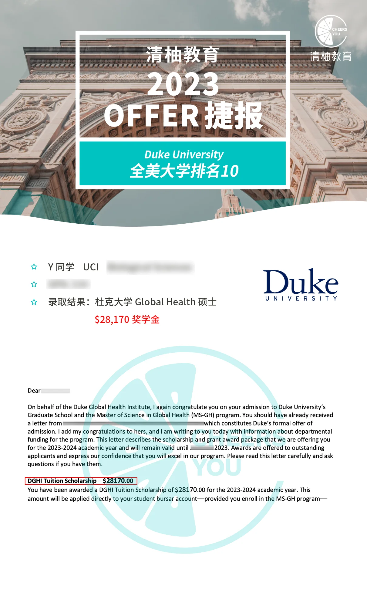 杜克大学Global Health硕士录取!$28,170奖学金!