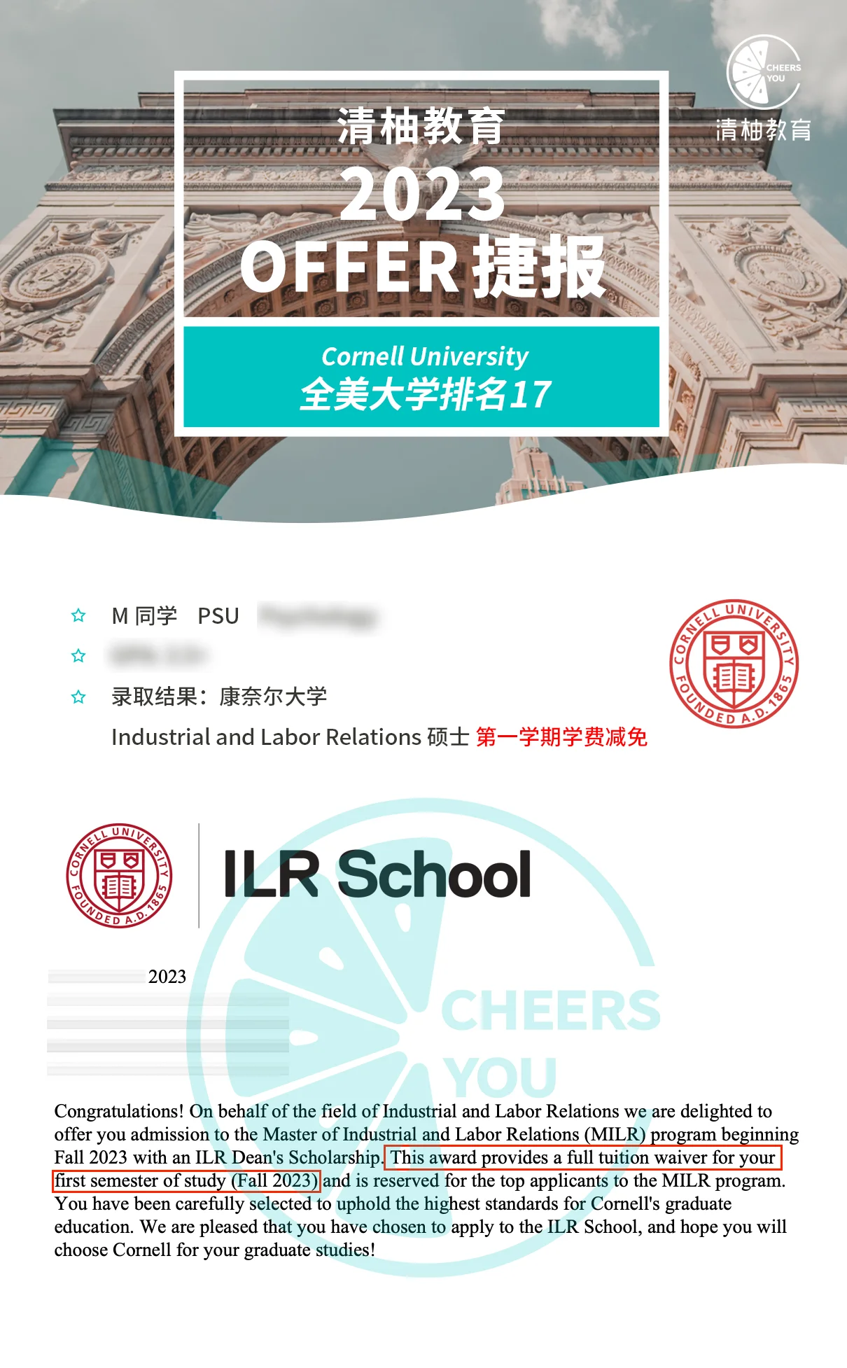 康奈尔大学Industrial and Labor Relations硕士录取!第一学期学费减免奖学金